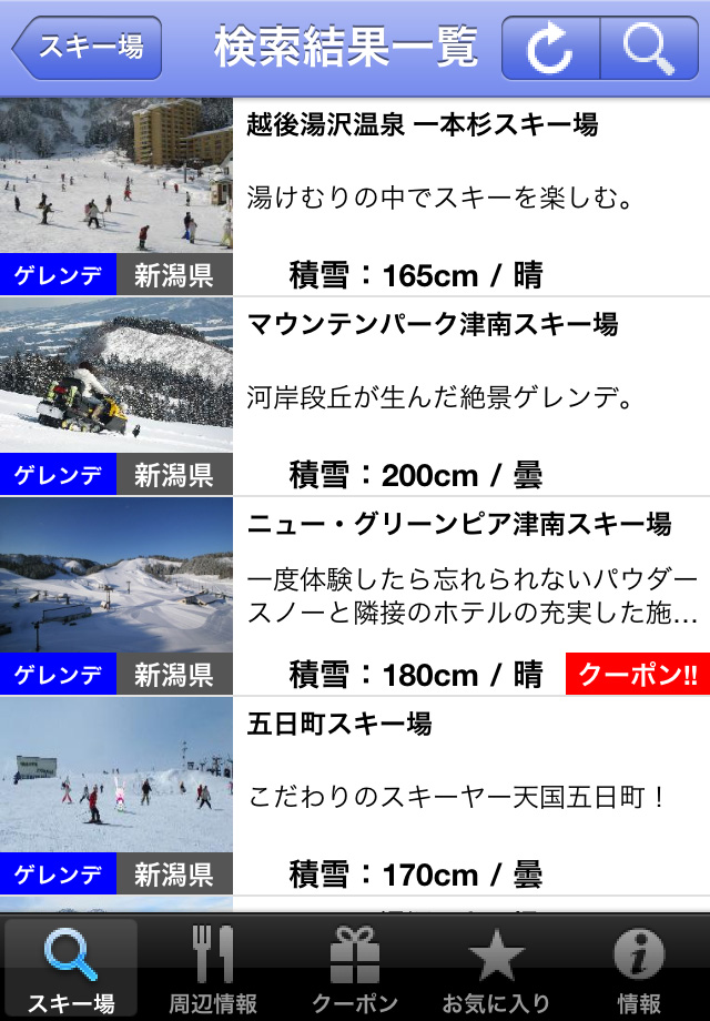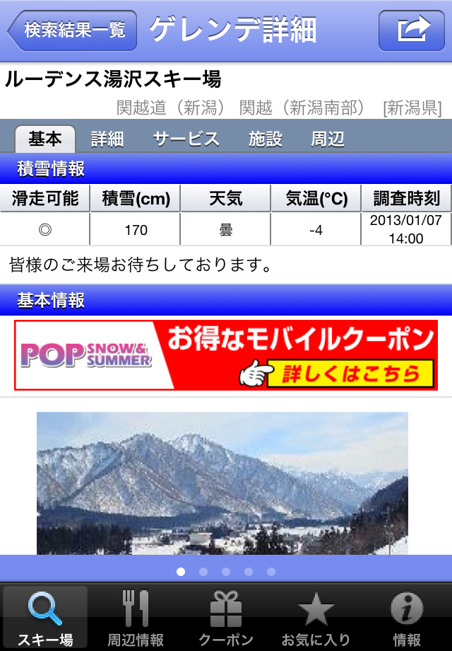 検索結果一覧は、写真付きで積雪情報・天気情報とともに表示されます。スキー場の特徴が分かる一言コメントも親切ですね。入場券やリフト券などが割引になるお得なクーポンを配信しているスキー場も!これはと思うスキー場が見つかったら、タップしましょう。ゲレンデ詳細画面が表示されます。