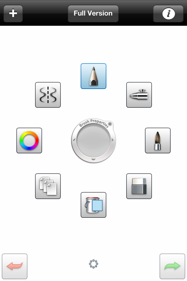 今回はiPhone版の画面でご説明します。アプリを起動すると、まず白い画面が表示されます。画面下部にある小さな円をタップすると、ツールメニューが表示されます。上から時計回りに[鉛筆][スプレー][ブラシ][消しゴム][塗りつぶし][レイヤ][カラー][左右対称]となっています。中央の円を左右にスワイプすると、鉛筆やブラシの大きさを、上下にスワイプすると透明度を変えることができます。[鉛筆][スプレー][ブラシ]の中から好みのものを選んで、さっそくお絵かきしてみましょう。 [カラー]をタップすると、好きな色に変更することができます。失敗したら、ツールメニュー下部の左側にある赤い矢印をタップすると、一つ前の状態に戻すことができます。消しゴムツールで少しずつ消すのも良いでしょう。