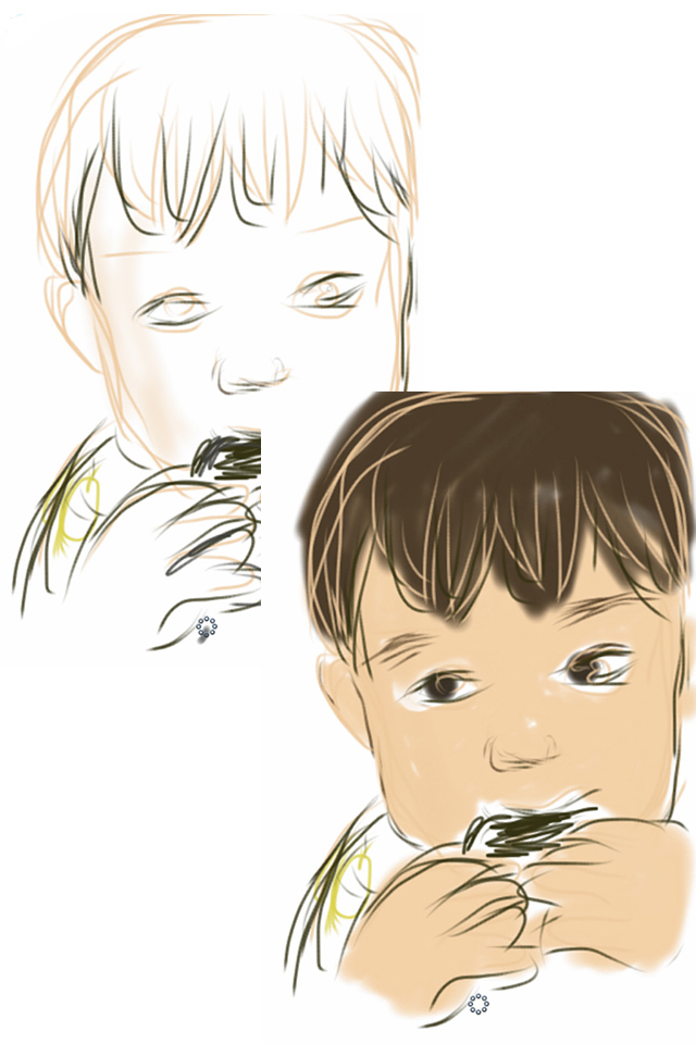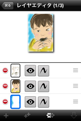 色塗りをするときにお役立ちなのが、[レイヤ]機能です。レイヤとは、階層のこと。[レイヤ]機能を使うと絵を描くシートを重ねることができるので、下描きするレイヤ・色塗りするレイヤ、のように階層を分けることができます。[レイヤ]ツールをタップすると、[レイヤエディタ]が表示されます。新しいレイヤを追加して、色を塗っていきましょう。失敗したときに[消しゴム]を使っても、レイヤが分かれているので、下描きはそのままで、塗りの部分だけ消すことができます。レイヤは3枚まで使えますので、上手に使い分けしてくださいね。細かい部分はピンチインで拡大しながら描くことができます。下手ながら、一生懸命描いてみました。「SketchBook MobileX」のおかげで、なんとなく絵になっている気がします!今回はiPhone4Sの画面を指でなぞりながら描いたのですが、大画面のスマートフォンやタブレットを使うときは、タッチペンがあると描きやすいと思います。本格的なイラストにチャレンジしたり、お子さんのお絵かきツールとして一緒に楽しんだりできるアプリです。ぜひ使ってみてくださいね!