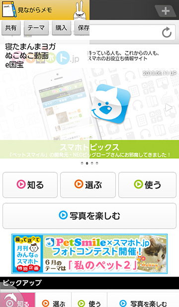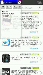 「見ながらメモ」はスマートフォンで見ている画面のメモを取りたいときに重宝するアプリ。Webサイトや乗換案内、地図などを見ていて「この情報をメモりたい!」と思ったときにいつでもかんたんにメモできるお役立ちアプリです。