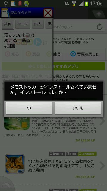 [テーマ]をタップすると、関連アプリ「見ながらメモテーマ」(無料)の紹介画面が表示されます。インストールすると、「見ながらメモ」の見た目の色などのテーマを変更することができます。 [購入]メニューでは[浮遊]メニューを使うための『浮遊モジュール』など、各種拡張モジュールを購入することができます。[保存]メニューで、メモを保存したい場合、[読込]で保存したメモを呼び出したい場合は、関連アプリ「メモストッカー」(無料)をインストールする必要があります。[表示]メニューは、付箋紙のように書いたメモを常に画面に表示する機能で、こちらも関連アプリ「いつでもメモビューワ」(無料)のインストールが必要です。各種設定は[設定]メニューから、上部のボタンを非表示にしたい場合は[ボタン]メニューをタップしましょう。メニューはたくさんありますが、使ってみるとシンプルで便利なアプリです。ぜひお試しくださいね!
