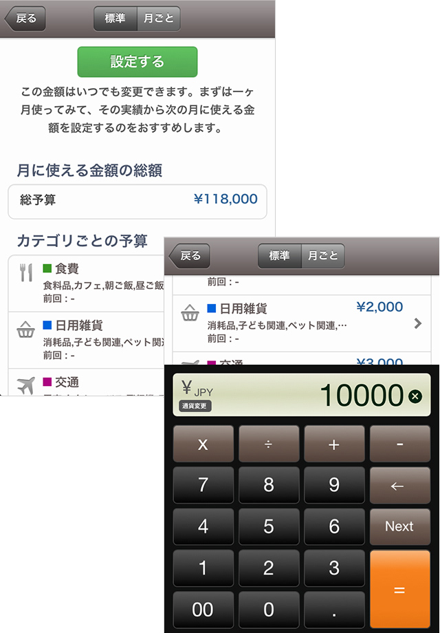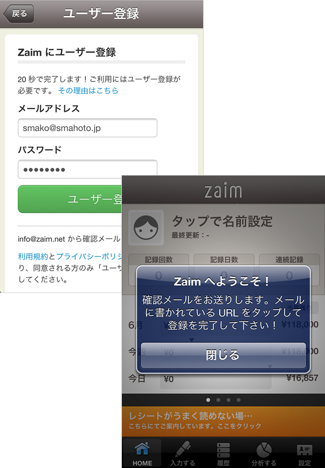 今回は、iPhone版の画面で解説しますね。アプリを起動して、まずはユーザー登録をしましょう。[初めての方はこちら]をタップして[ユーザー登録]画面に進みます。メールアドレスとパスワードを入力して[ユーザー登録]をタップしましょう。入力したメールアドレスに確認メールが届きますので、書かれているURLをタップして、登録を完了してください。しばらく待って画面が変わらない場合は、[戻る]をタップして、登録したメールアドレスとパスワードでログインしましょう。ここで登録したメールアドレスとパスワードを使ってWeb版(https://zaim.net/)にログインすることもできます。外出先ではアプリ、家ではWeb版というように、状況によって使い分けることができるのは有難いですね!続いて初期設定を行いましょう。まず、記録する通貨の単位・週の開始曜日・月の開始日・年の開始月を設定します。次に、月に使える金額を決めましょう。カテゴリごとの予算を入力すると、月に使える金額の総額が表示されます。予算の金額はいつでも変更できますので、まず一ヶ月使ってみて次の月に使える金額を調整して設定するのと良いでしょう。