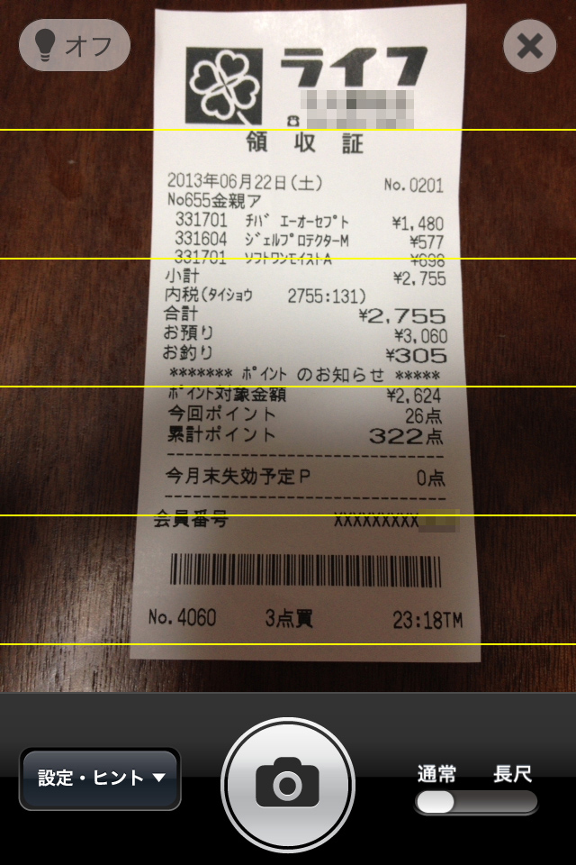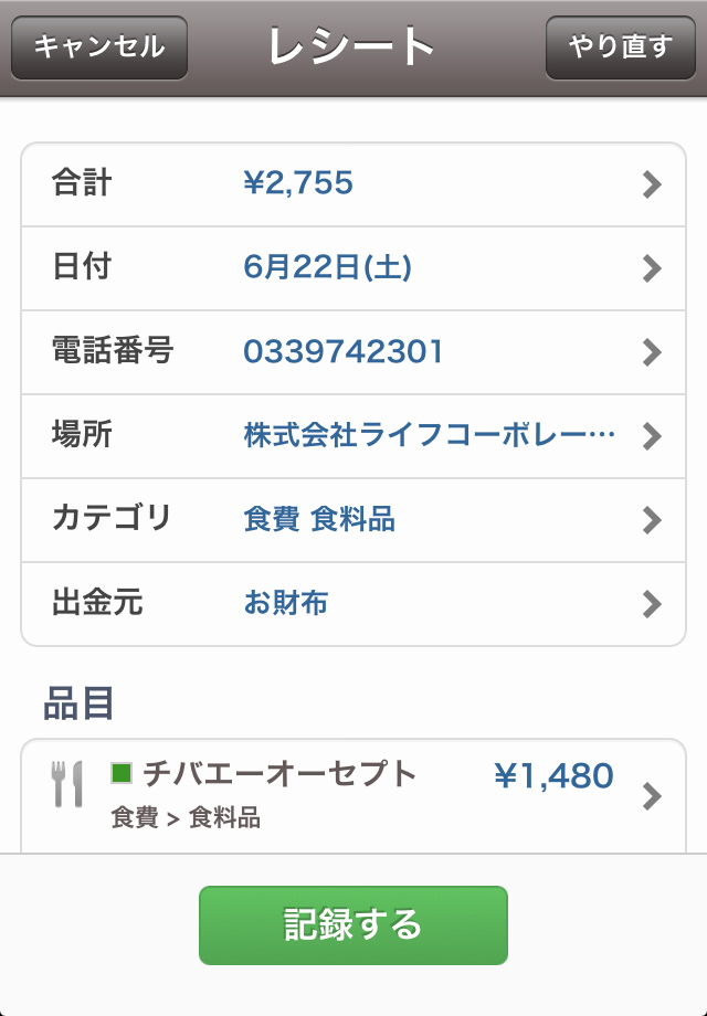 次に、支出の入力をしましょう。画面下部の[入力する]ボタンをタップすると[支出カテゴリを選択]という画面が表示されます。支出カテゴリと支出ジャンルを選択し、手動で入力することもできますが、イチオシはレシート読み取りでの自動入力!支出カテゴリの一番上にある[レシートを撮影して入力(β)]をタップすると、レシート読み取り画面が表示されます。画面上にある黄色い線とレシートを水平にして、約10cmほどの距離で、真上から撮影しましょう。カメラボタンをタップして読み取り開始!読み取りに成功すると、[合計][日付][電話番号][場所][カテゴリ][品目]が自動で入力された画面が表示されます。問題なければ[記録する]をタップして、入力完了。とってもかんたんですね![カテゴリ]を変更したり日付を変更する場合は、それぞれの項目をタップして修正してください。「Zaim」のレシート読み取り機能は、平均認識率96%(アイエスピー調べ)ですが、影が入った、ブレた、ピントが合わなかったなどの理由で、うまく読み取れない場合もあります。コツをつかんで活用してくださいね。