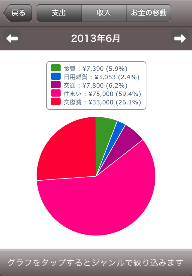 画面下部の[HOME]ボタンをタップすると、最終更新日、これまでの記録回数、記録日数、連続記録回数が表示されます。また、今月・今週・今日の支出が棒グラフで表示され、前月・前週・前日比も一目瞭然!棒グラフの逆三角マークが、右側にあれば「支出が少なめ」、そうでなければ「支出が多め」という意味。使いすぎにもすぐに気づくことができますね。[分析する]ボタンをタップすると、より詳しい内容を確認することができます。収入や予算の合計、カテゴリごとの支出と予算からの差し引きでの残額が表示され、[週ごと][月ごと][年ごと]で表示を切り替えることができます。右上に表示されている[…]をタップすると、[円グラフ]のメニューが表示されます。カテゴリごとの金額が円グラフになっているので、何にたくさんお金を使っているか、という割合がよくわかりますね。 [支出][収入][お金の移動]で、表示を切り替えることができます。お小遣い帳としての利用はもちろん、アカウントを共有して夫婦で使うこともできるので、日々の家計管理にぜひお試しください!