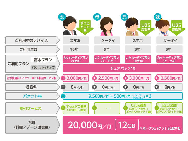 もし全員が同じくらい通信を行う場合、全員がバラバラのプランに入るより、まとめてシェアする方がお得になる可能性が高いのです。
