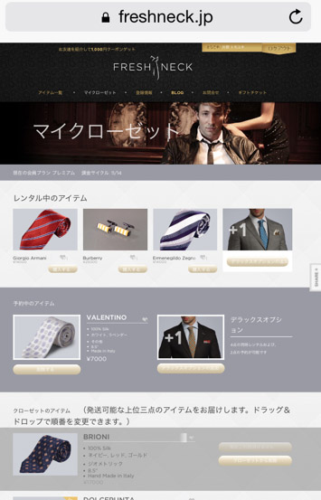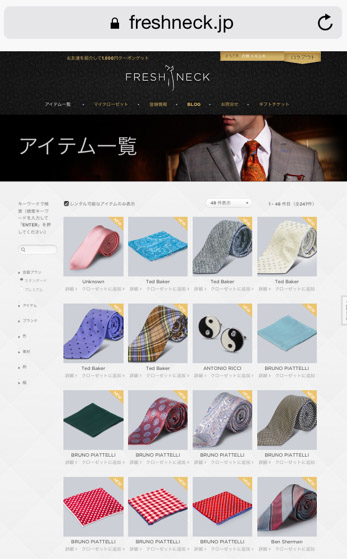 「FreashNeck」(https://www.freshneck.jp/)は、男性のスーツを彩るアイテム「ネクタイ」「ポケットチーフ」「カフリンクス」などを、月額3,800円(税込)でレンタルできるサービスです。「テッドベーカー」や「アルマーニ」「ゼニア」など、約80種類以上のブランドが揃っていますよ。