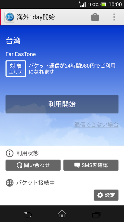 専用アプリ「海外1day開始」(Android/無料)で「海外1dayパケ」の利用開始、利用状況の確認ができますよ。