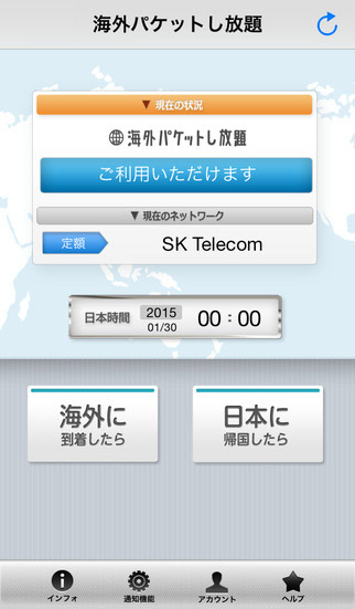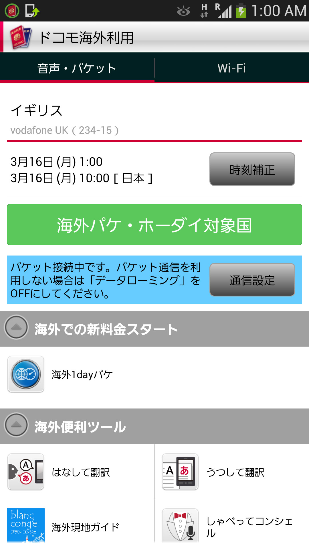 アプリ「ドコモ海外利用」(Android/無料)があれば、渡航先が「海外パケ・ホーダイ」の対象か確認でき、日本の時間もチェックできます。