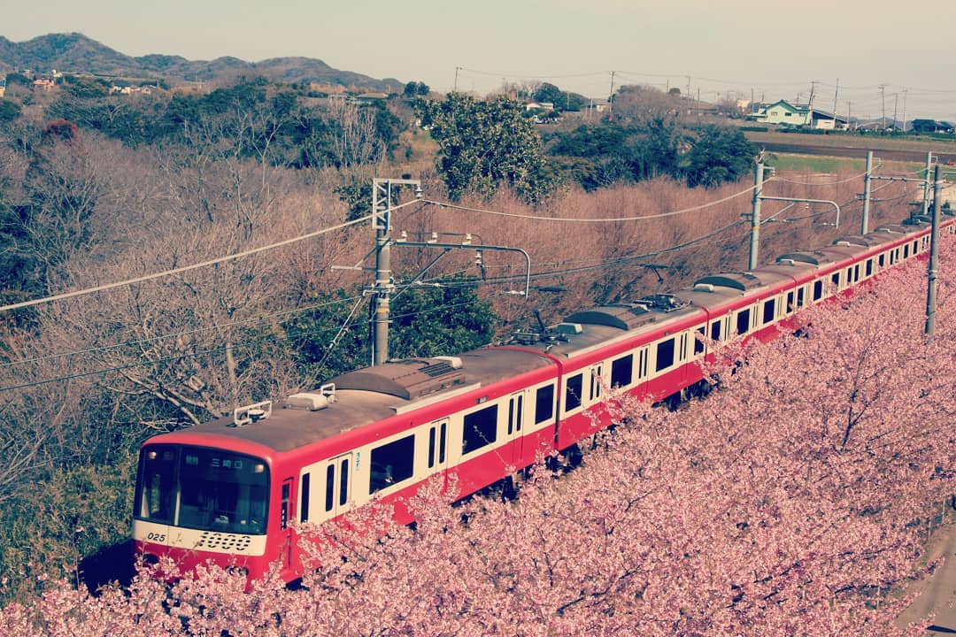 三浦海岸の桜と京急電車を収めた1枚。同じ桜でも、車窓から見る景色とは一味違います。早春の三浦を分かりやすく表現された作品です!