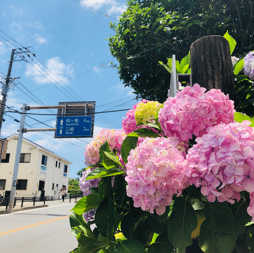 紫陽花と青空、ピンクと緑と青のコントラストが素敵な1枚。城ヶ島に向かう途中でしょうか?晴れの日の三浦は本当に気持ちが良いですよ~!
