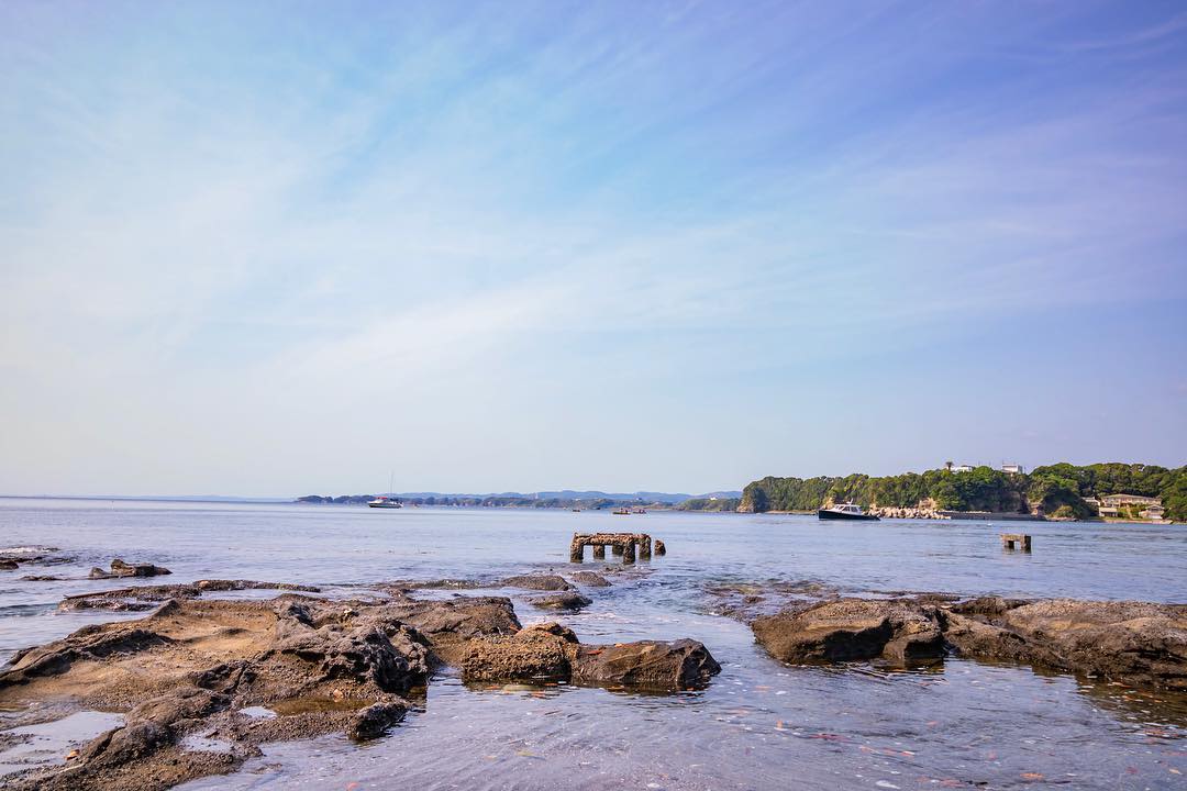 油壺湾での1枚でしょうか。干潮時の岩肌が出ている感じ、水が引いていっている様子など、砂浜とは違う印象に目をひかれました。