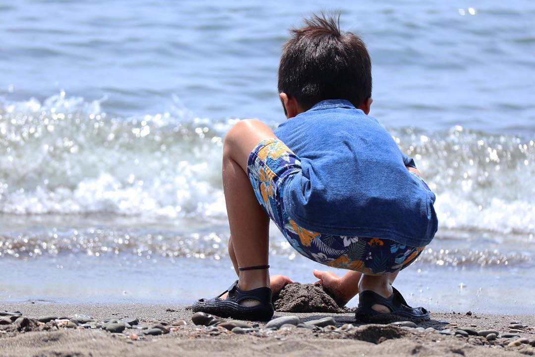 写真越しに波の音が聞こえてきそうな作品です。お子様の「まだ帰りたくない!」という気持ちを、背中と砂山が物語っていますね!