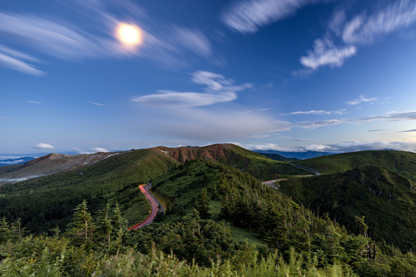 広角レンズは遠近感を強調することができます。スローシャッターと組み合わせることで動感がうまれ、ダイナミックな表現が可能です。峠に登ってくる強い風で手前の笹の揺れは大きく、奥の樹々の揺れは小さく表現されます。これにより手前の笹の揺れが強調され、より迫力のある動感を得ることができます。風によってうまれた揺れを主題にする際は広角レンズを使用し、被写体にぐっと近寄って撮影します。