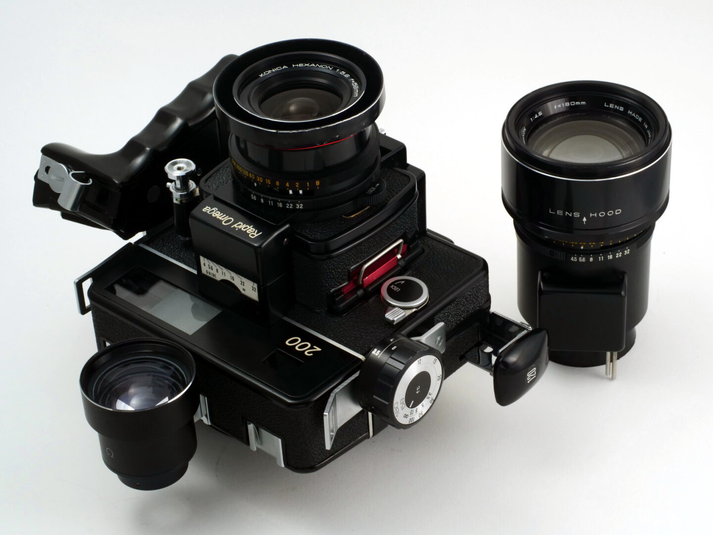 認識プレートにはマミヤ製とありますが、一般的な認識としてラピッドオメガは小西六写真工業が販売していた中判のレンジファインダー機であるコニカプレスをベースとしたカメラとされています。元をただせば米国のSimmon Brothers,Inc.が製造していた合体ロボっぽいプレスカメラの基本的構造を保ちながら小西六写真工業が改良し、米国ではKoni-Omegaという名前、国内ではコニカプレスとして発売されていたようですが、本機の製品名はRapid Omegaということで謎は深まるばかりです。