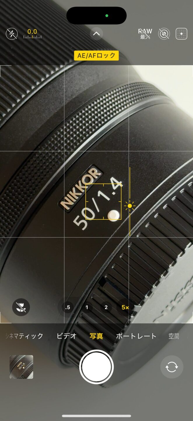iPhoneの場合は、ディスプレイ上で被写体を指先でタップして、現れた四角いフォーカスポイント右にある「太陽」アイコンのスライダーを上下して、好みの明るさに調整します。フォーカスポイントを長押しすれば「AE/AFロック」もできます。ピントと露出が固定できるので、同じ距離かつ同じ明るさで連続撮影する場合は便利ですよ。ちなみにこのときも露出補正が可能です。