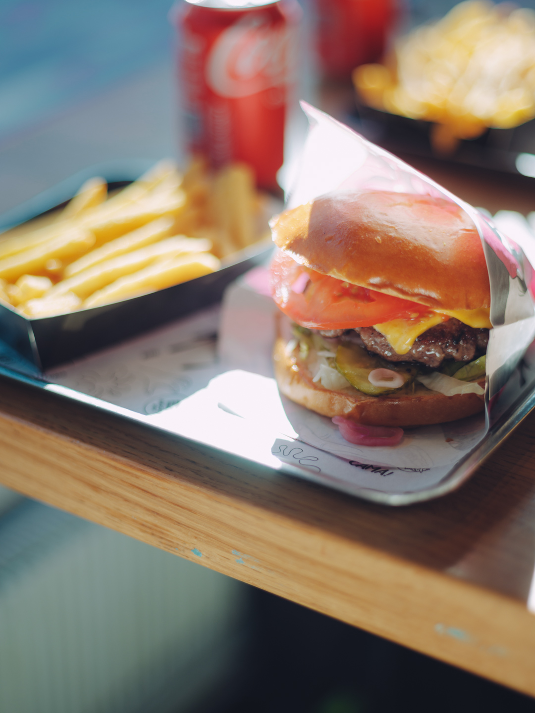 ランチ難民になった時に、たどり着いたハンバーガー。このレンズの最短撮影距離は0.7mとあまり寄れないことが難点ではありますが、だからこそ旅のワンシーンを余白を交えて残せます。