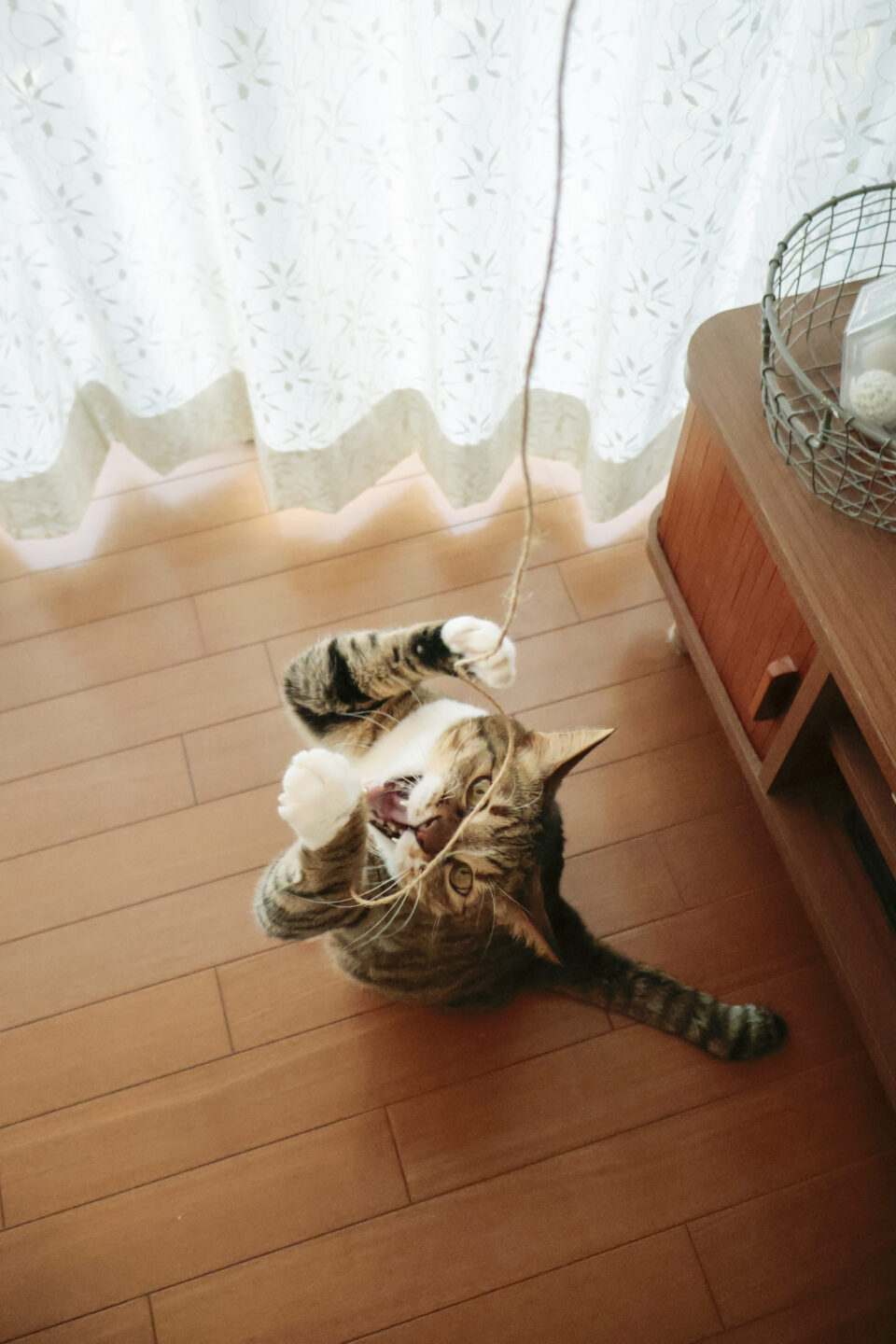 我が家の次男坊が紐に夢中な姿を撮影。【顔+追尾優先AF】を選択していたので紐が目にかかったシチュエーションでもしっかりと瞳を追い続けてくれました。