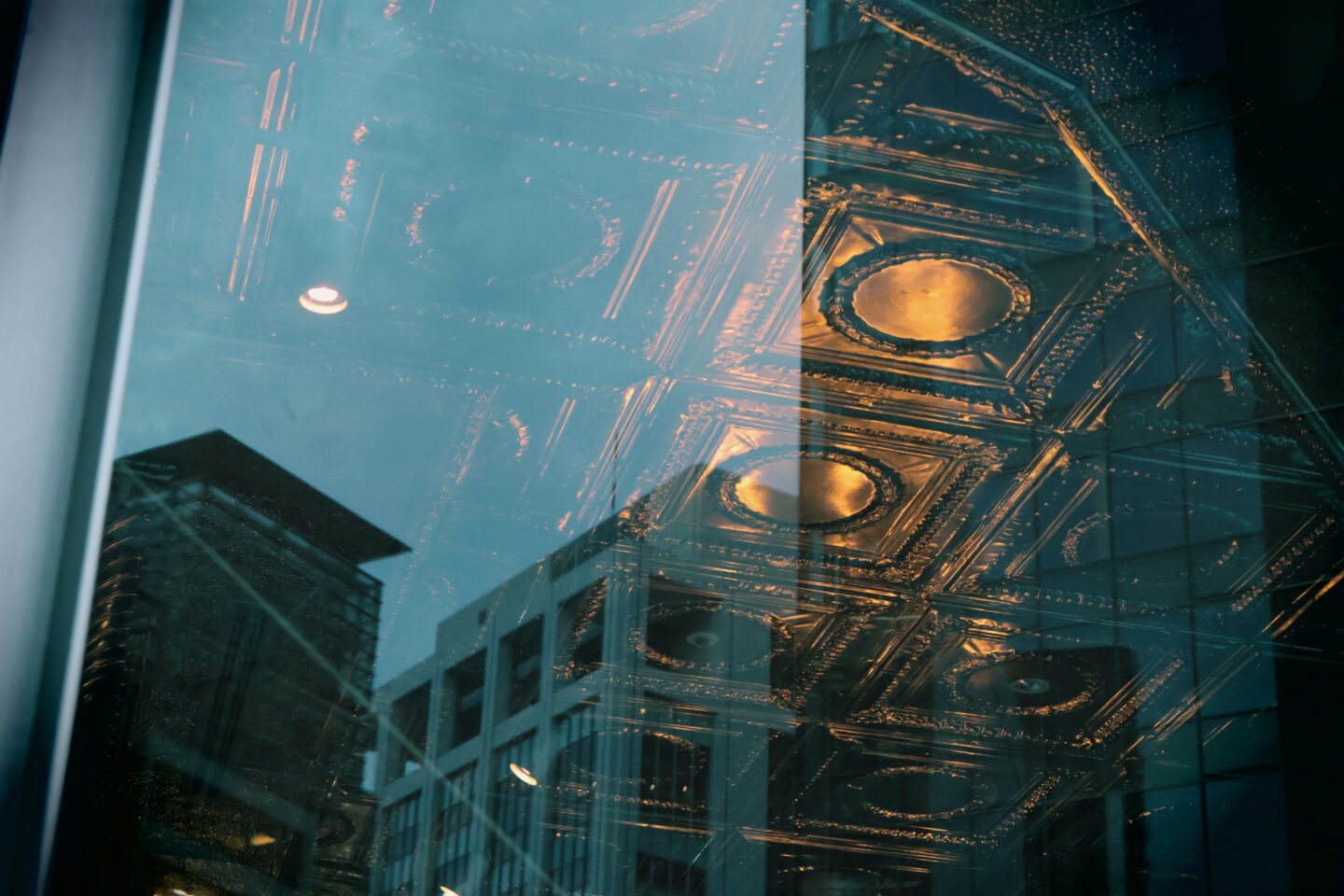 きらびやかな装飾の天井が印象的なカフェを、窓越しにクリエイティブフィルター【トイカメラ風】で撮影しました。物語に出てきそうな重厚な雰囲気の室内と窓ガラスに映った現在のビル群の対比を、レトロな雰囲気の色合いがプラスされる【トイカメラ風】が程良く調和しつつ、不思議な世界観を作り出してくれました。