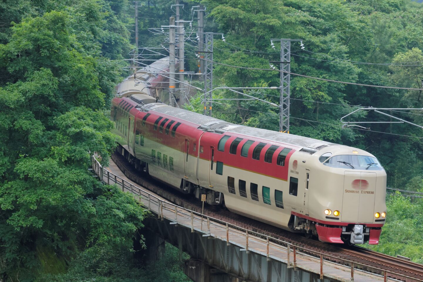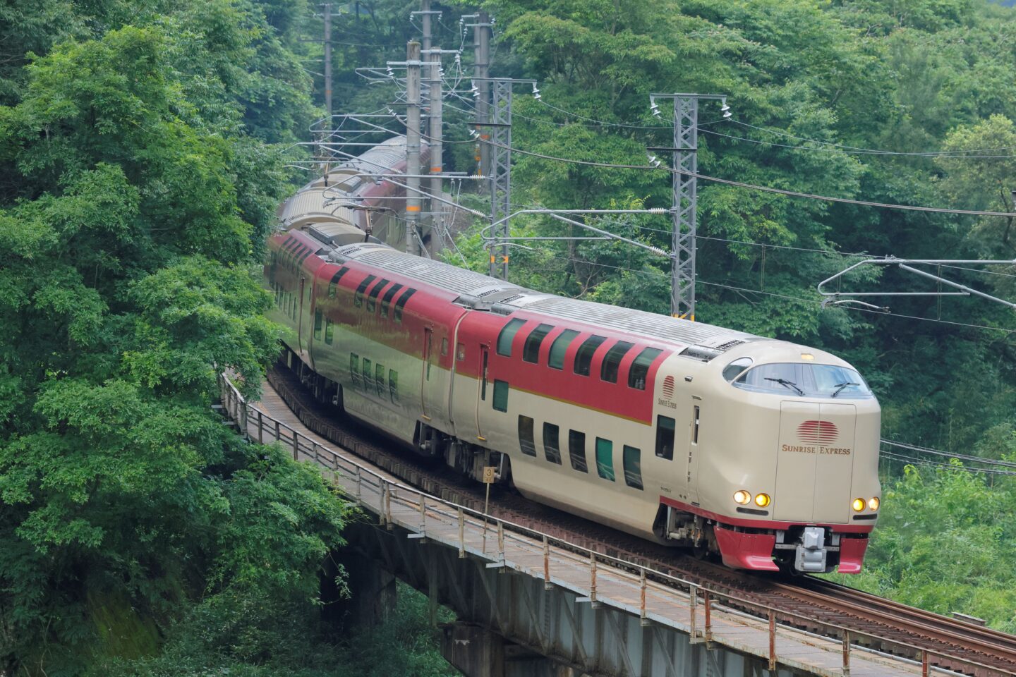 こちらのカットを撮影しに訪れたのはJR西日本の伯備線。この路線は全国的にも希少な存在である国鉄形特急車両「381系」が今でも活躍しているほか、国内では唯一の定期寝台特急列車となった、東京駅と出雲市駅を結ぶ「サンライズ出雲」が走行しています。早朝、東京から夜を越えて走ってきた「サンライズ出雲」が姿を現しました。この日は曇りで山間の早朝ということもあり、やや露出はシビア。ISO1600に設定し、撮影しています。APS-Cセンサーを搭載したカメラはフルサイズセンサー機に比べて、物理的に高感度性能が劣る傾向がありますが、EOS R7は高感度時の画質もしっかりとした解像感があり、ISO1600程度では全くリスクは感じません。むしろ、動体ブレを防ぐことができる高速シャッターをしっかりと確保できるので、さまざまなシーンで確かな描写力を見せてくれる印象です。