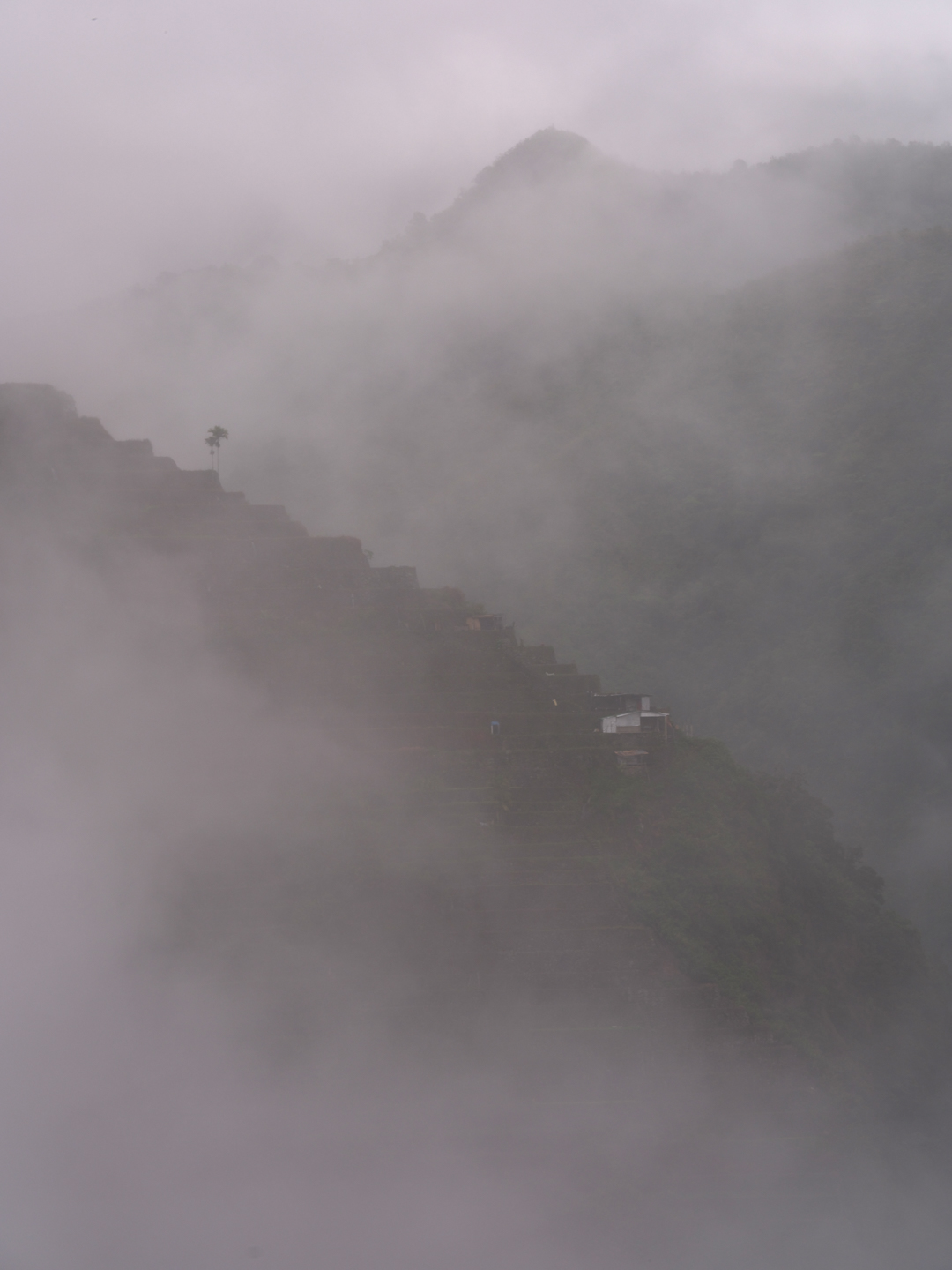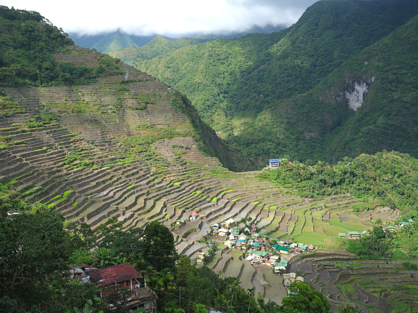 徐々に霧が晴れてその全貌を望むことができました。急勾配の土地に作られているためひとつひとつの棚田は狭いのですが、それが無数に点在する様は圧巻でした。山岳民族のイフガオ族が、標高1,000mを越える高峰の山腹をほとんど人力だけで耕し、米を作り、昔ながらの生活を2,000年以上にわたって守り続けてきた光景です。