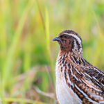 年々生息数が減少し、環境省レッドリストで絶滅危惧II類に分類され、その姿を見ることも希少となりつつある野生のウズラのオス。