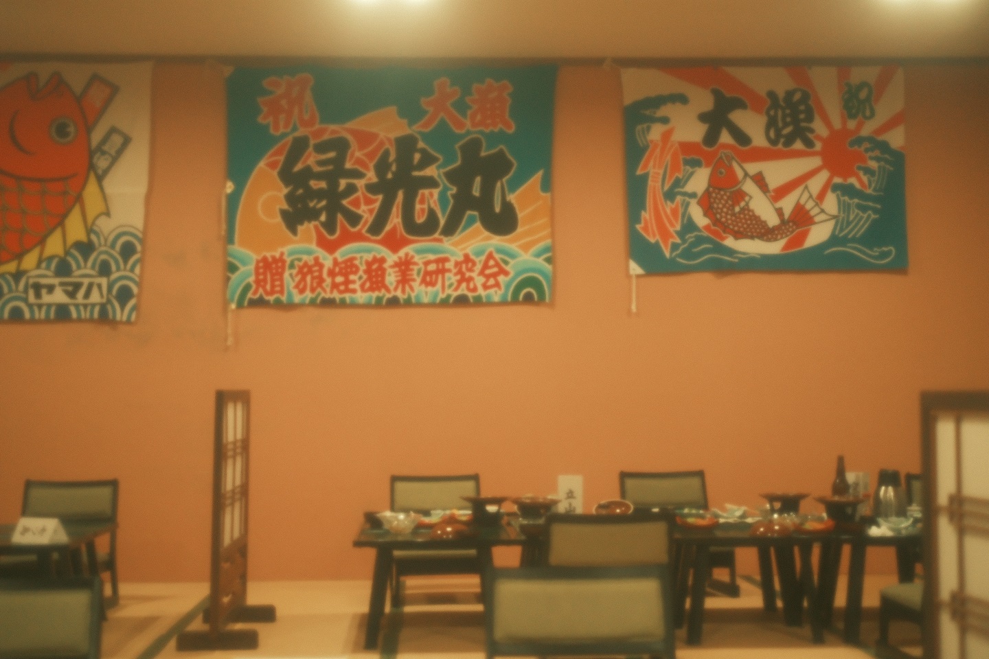 大漁旗が飾ってある。旅館は船を持っているらしくて、お刺身も美味。