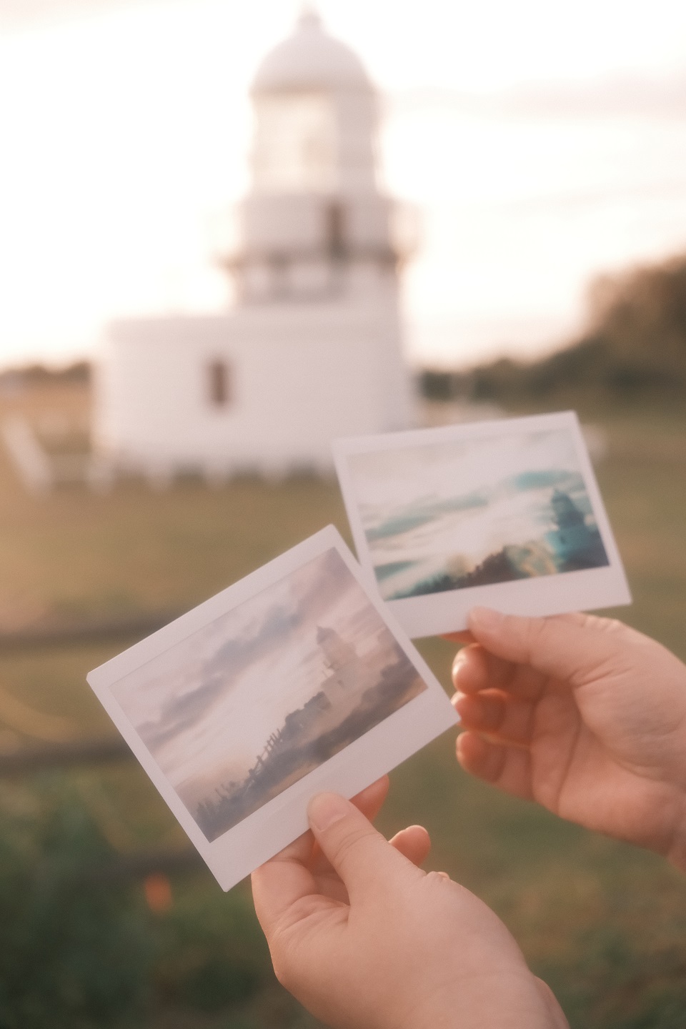 ここで、instax WIDE Evoのカメラ機能で灯台の写真を撮ってみた。旅の最中、カメラを変えて撮るって、なかなかできないことも多い。