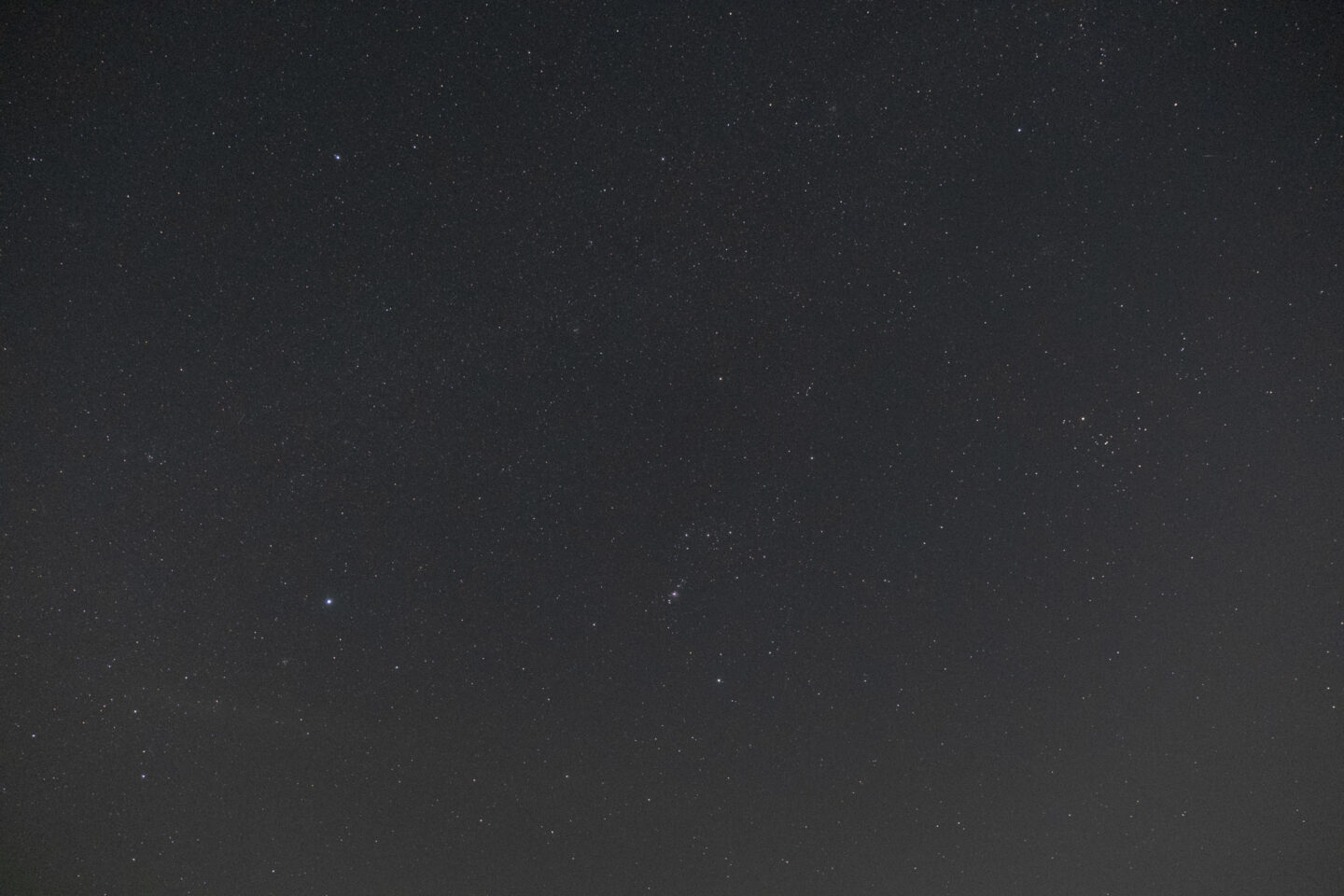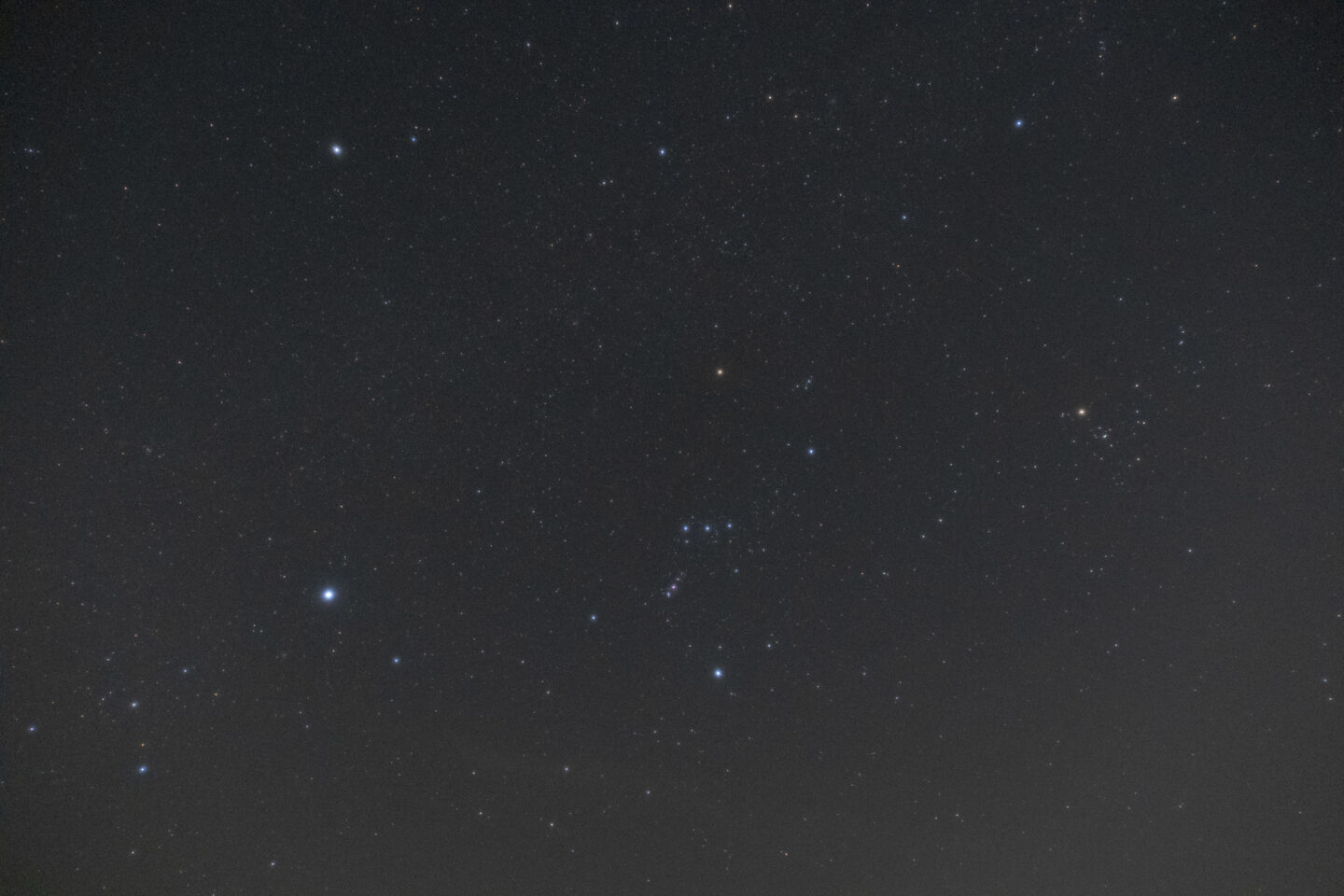 オリオン座付近の星空を広角端(16mm)で撮影。赤道儀を使用していないため、日周運動による露出中の星のブレを防ぐという意図で短い露出時間で撮影しています。この画像の右上部分を100%で拡大してみましょう。