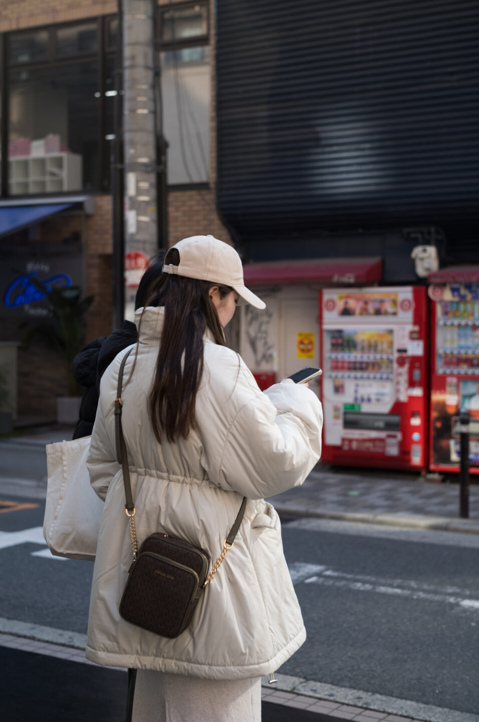 心斎橋からアメリカ村へ向かう。明るく賑やかでスナップもしやすいため、以前大阪に暮らしていた際も度々出かけていたエリアだ。2月の寒い時期ではあったが皆思い思いのファッションを楽しんでいる様子をただ眺めるのも楽しいもの。どこか店を探しているのだろうか。立ち止まってスマホでなにかを検索するカップルが目についた。レンズはライカ ズミルックスM f1.4/50mm ASPH. に付け替えたのでLIGHT LENS LAB M 35mm f/2 よりも柔らかな描写。ははあ、LIGHT LENS LAB M 35mm f/2のすっきりとコントラストの高い写りもいいけれど、この光がふわりと回り込むような写りは格別である。