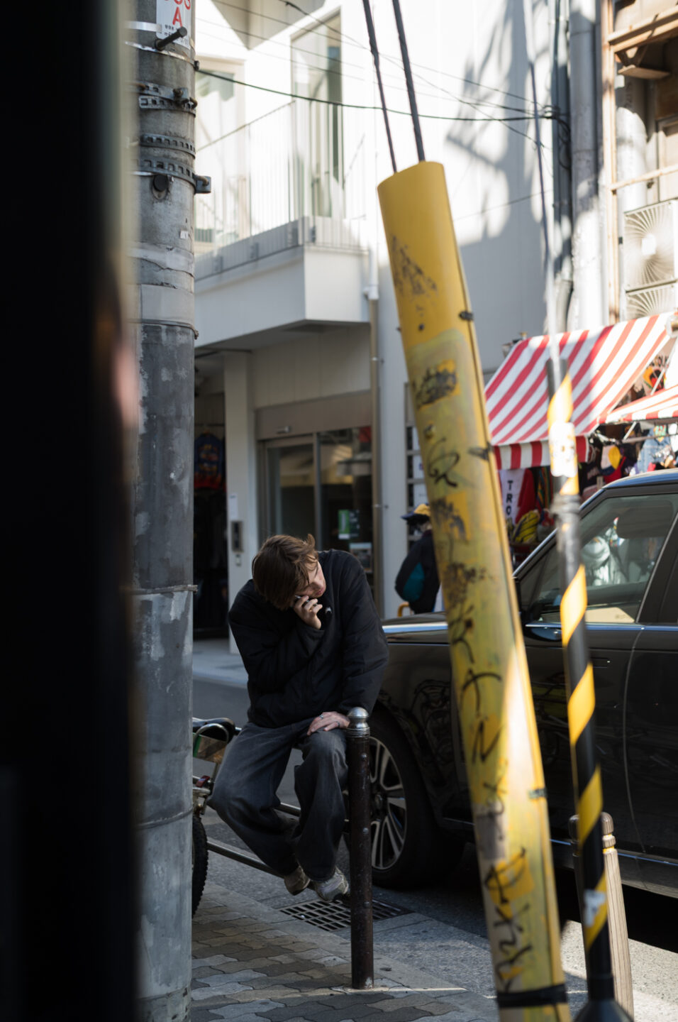 古着屋の前でなにやら話し込む男性を電線のカバー越しに撮影。普段スナップはモノクロで撮影することのほうが多いが、カラフルな街は断然カラーで撮りたくなるものだ。ちょうど冬の光が傾きかけてきた頃。鮮やかなものはより鮮やかに、街を構成するさまざまな構造物がオブジェのように影を落とし、撮影がより楽しくなる時間帯だ。あくまで街歩きを楽しみつつ、気づいたものをライカM11 グロッシーブラックで拾い上げてゆく。中身は通常のライカM11と同じなのに、この高揚感というのはやはりこのスタイルの美しさからくるものなのだろう。気分が高揚すれば、もっと写真を撮りたくなる。いまさらながら、カメラの価値は性能だけではない。