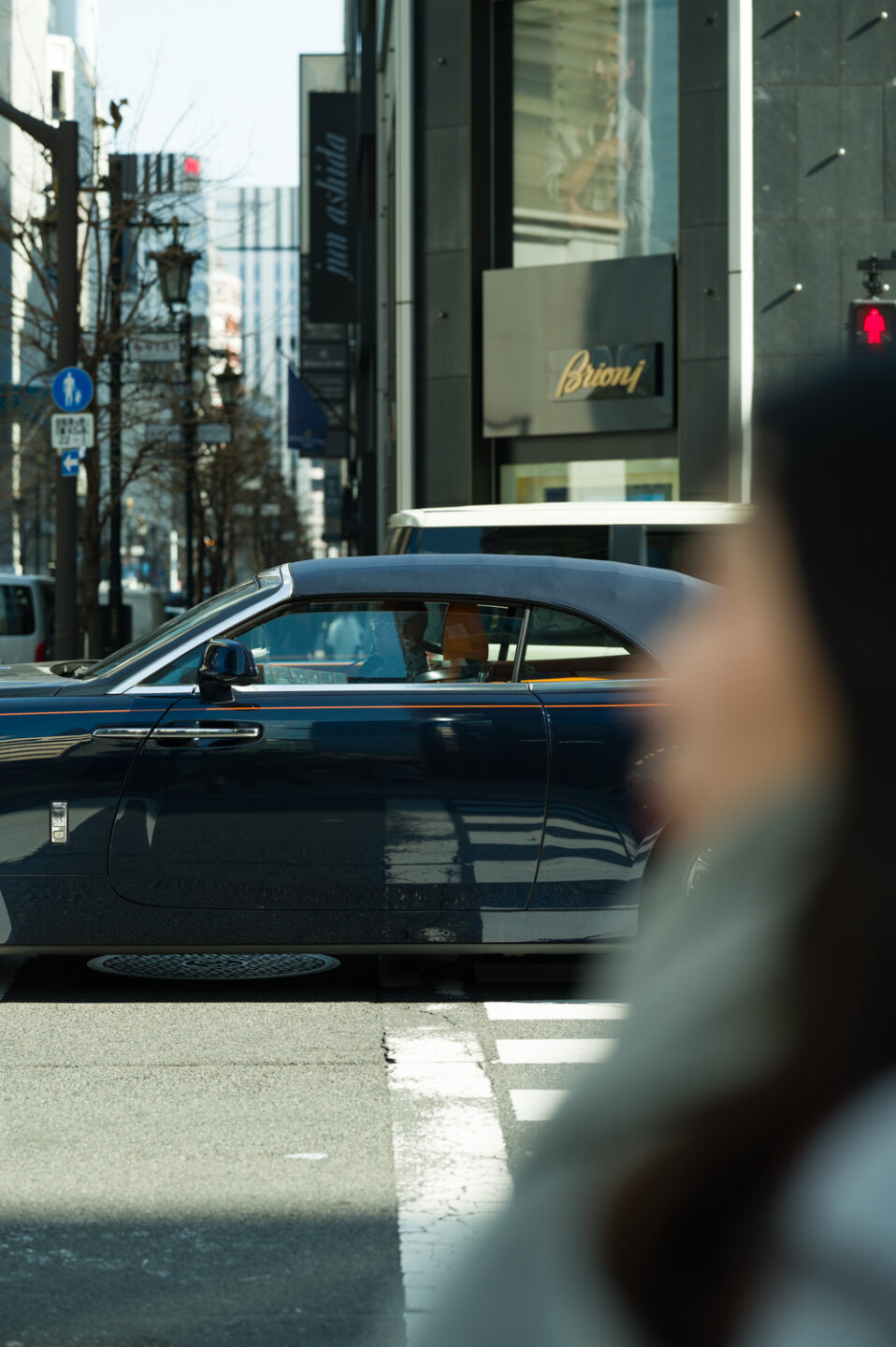 先ほどと同じく交差点の信号待ちでもう一枚撮影。銀座はほんの10年前と比べるとだいぶ様変わりしたように感じられるが、やはり大人の街である。今回使用しているライカ アポ・ズミクロンSL f2/90mm ASPH.にも言及すると、前ボケはごくごくやわらかく自然、ピント面はピシリと忠実にシャープ、かつ立体感豊かに描写。もちろんアダプターを使用してライカMレンズを装着しても楽しいが、この写りを経験してしまうと、ついこのレンズばかり使ってしまう。