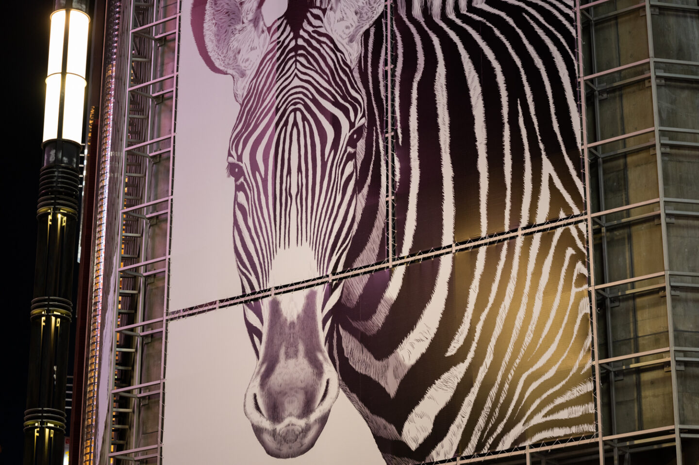 Ginza Sony Parkの壁面に浮かび上がる夜のシマウマ。ライカSL3に弱点があるとすれば低照度下での撮影だろうか。ISO4000までならまったく問題なく撮影できるが、ISO6400を超えるとややノイズが目立ってくる。とはいえ、銀座は夜でも明るいのがいいところ。