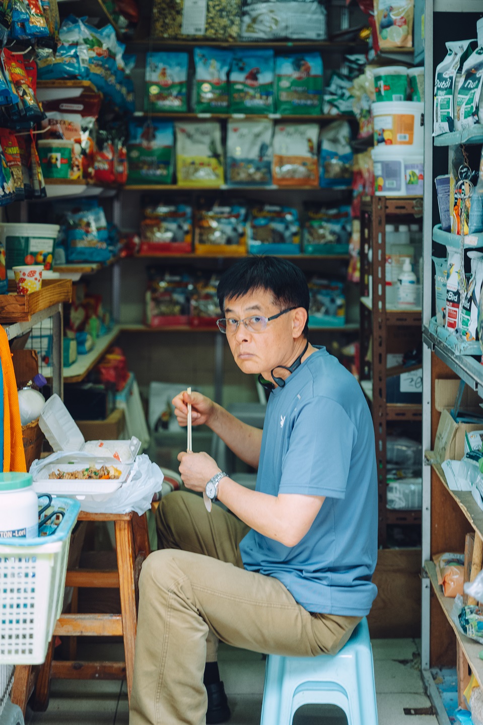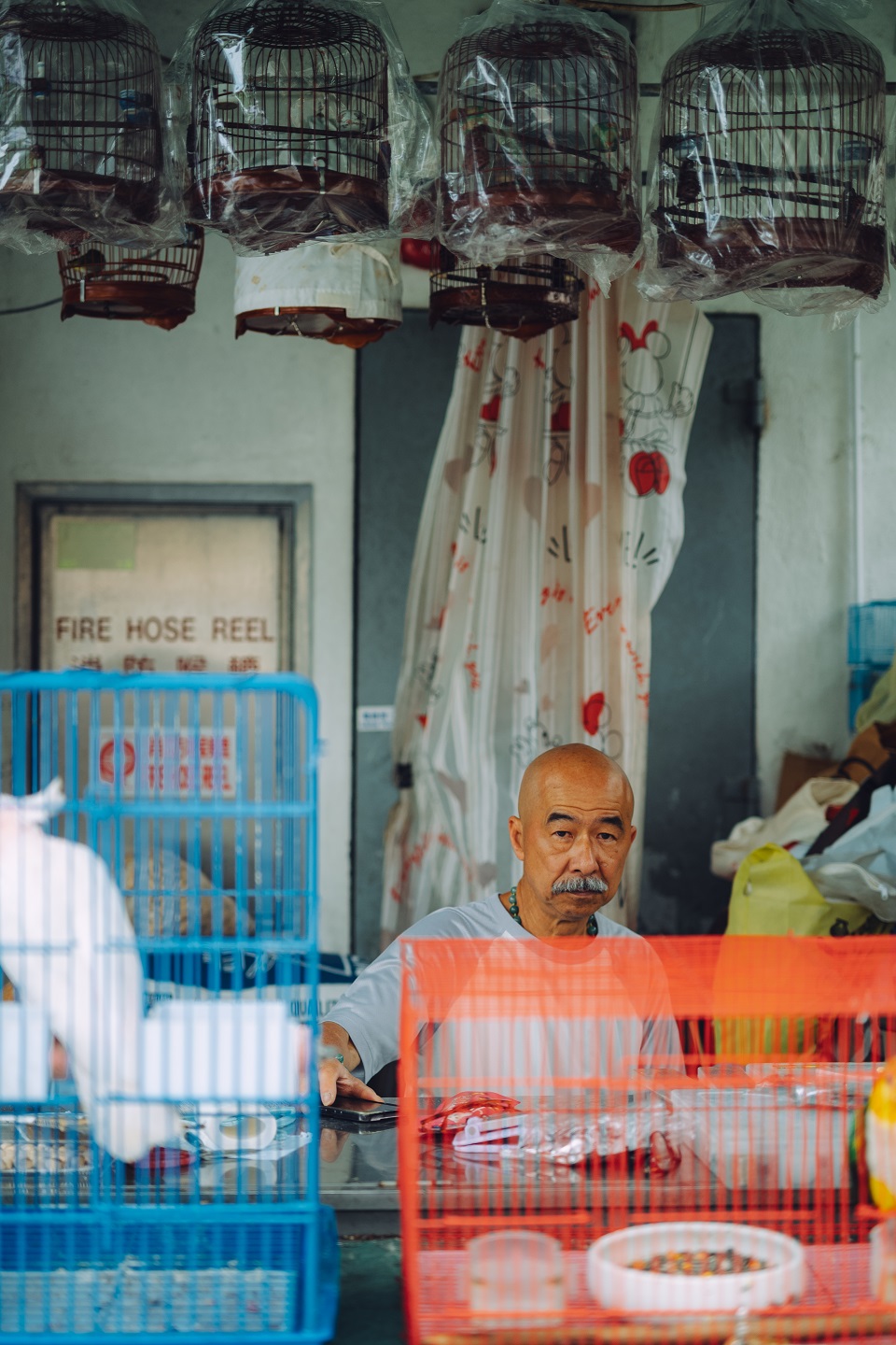 籠の中にひしめくインコや九官鳥、生きたまま売られている餌となるコオロギや蛙。その背後で、まるで彼らもまた記憶の中のオブジェのように佇む店主たち。