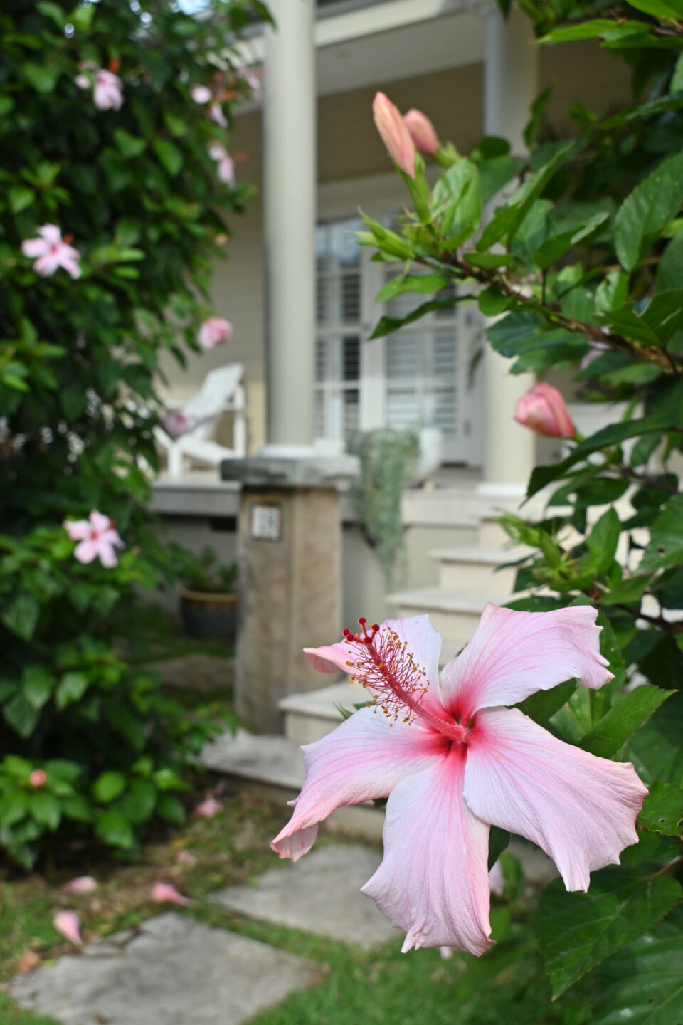 主役となる被写体(ハイビスカス)の大きさはおおよそ同じくらいになるように配置し、やはりそれぞれ12mmと28mmで撮り比べてみました。結果として背景の入り方が大きく異なるとともに、被写体の歪み(広角は歪みが大きくなる)にも違いが出ることがよくわかります。
