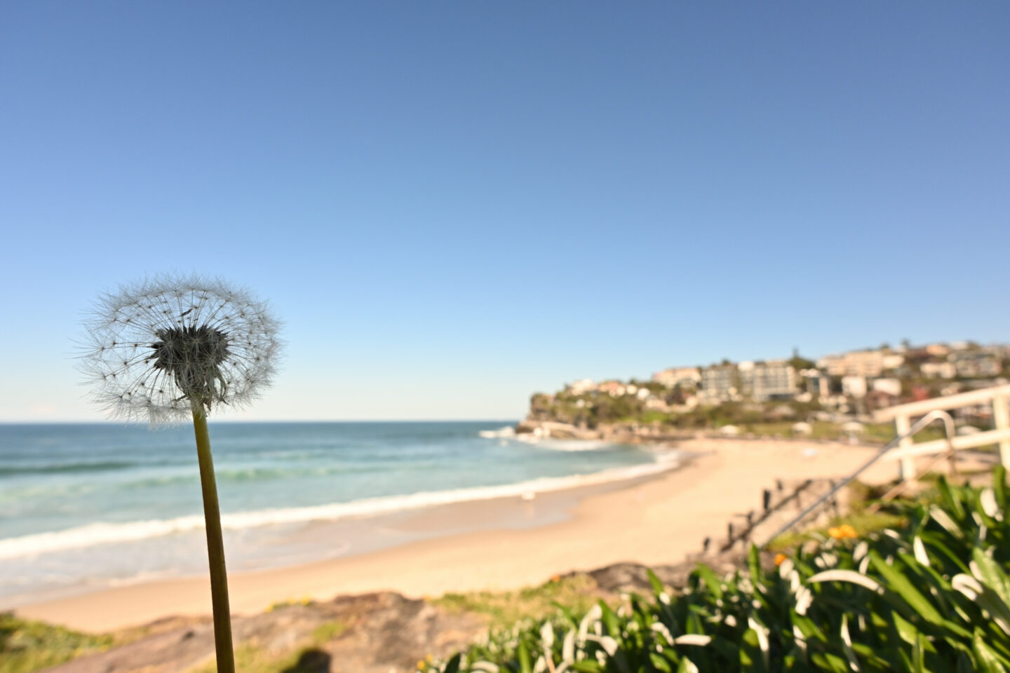 シドニーで有名なボンダイ・ビーチの南にあるブロンテ・ビーチから海岸線に沿って続く遊歩道脇に綿毛を見つけました。一番広角側で綿毛に近付いて撮影しましたが、広角ゆえにうんと近付いても背景がうんと広く入ることがわかります。尚、この時のカメラと被写体の距離感を、スマートフォンでも撮影してみました。