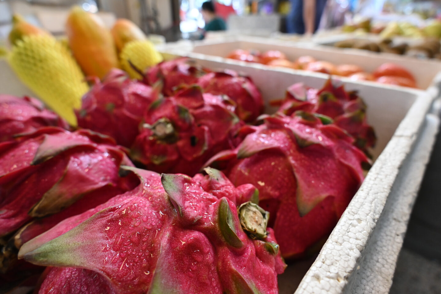 台南で100年を超える歴史を持つ市場「東菜市」へ。果物屋さんの店頭に並んだドラゴンフルーツに目が留まり、撮影させてもらいました。表面を覆う水滴からみずみずしさを伝えるため、水滴にギリギリまで近付いて撮影。やはり「寄れる」というのは楽しいものです。