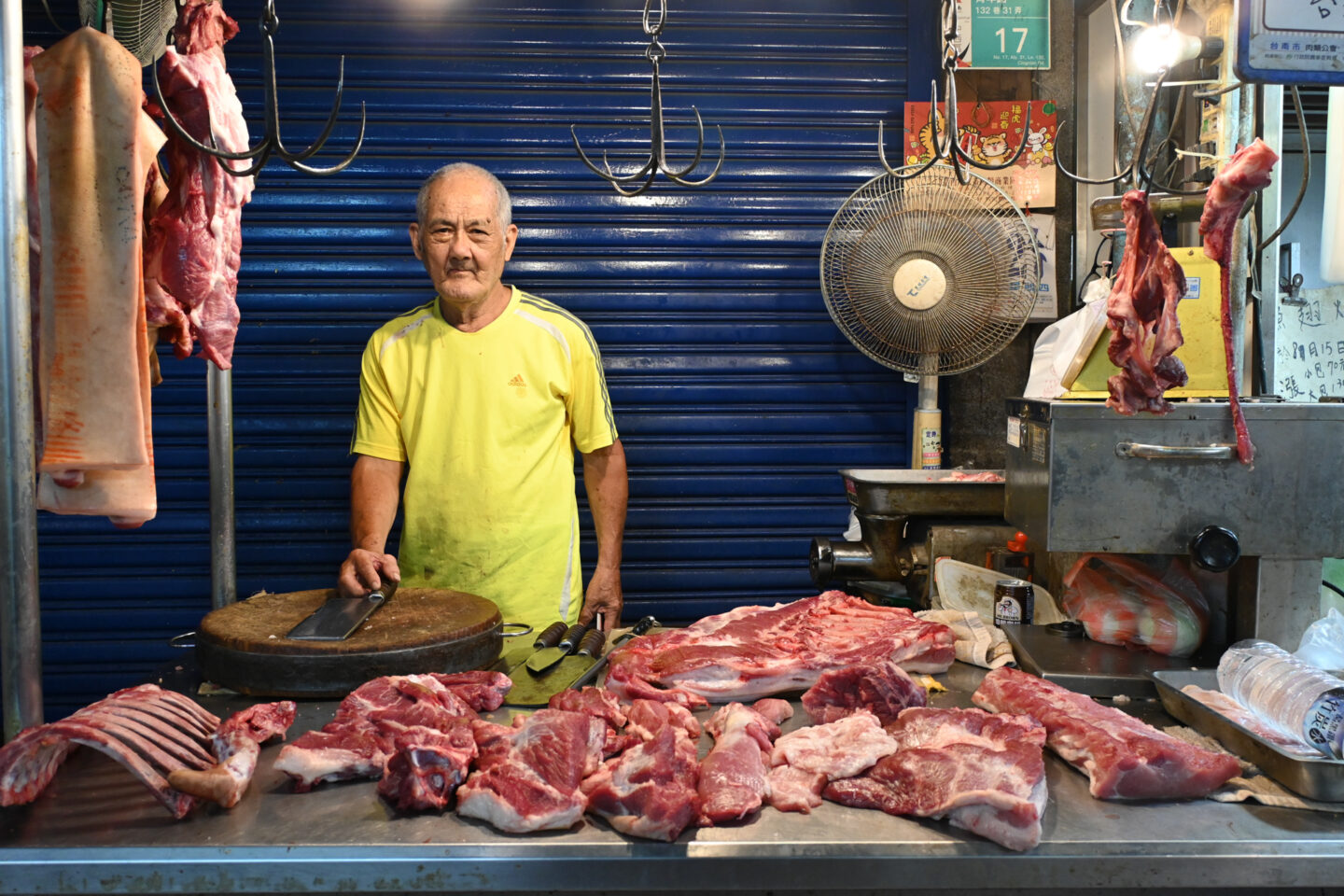 台南の東菜市内を撮り歩いていると、八百屋のおじさんに声を掛けられました。おじさんのお店とすぐ隣のお肉屋さんとは隣接する別の建物になっていて、古くからある市場が拡張されたんだ、ここがその境目なんだよ!と……。中国語はさっぱりわからないのですが、どうやらそんな説明をしてくれたみたいでした……たぶん(笑)。せっかくなので、説明のあとに奥のお肉屋さんも画角に入れて広角側でおじさんを撮らせてもらいました。