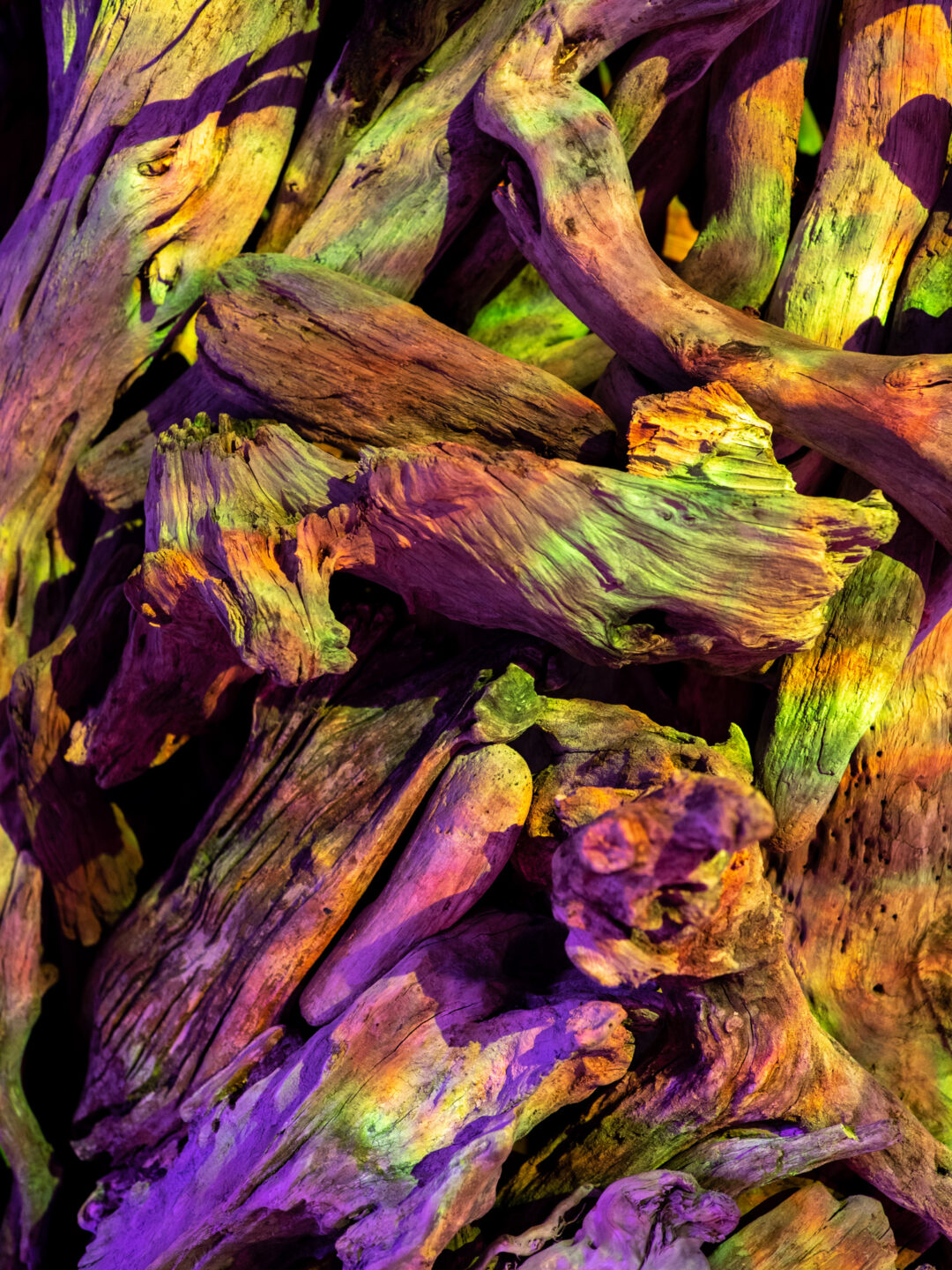 この水族館はとても照明に凝っていて、泳いでいる鯉や樹木などもこのような色彩で表現できます。ただ、実際の色ではないため、あくまでデザイン的に撮影するのがポイントです。上の写真はわざと落下防止の網も取り入れて作画しました。
