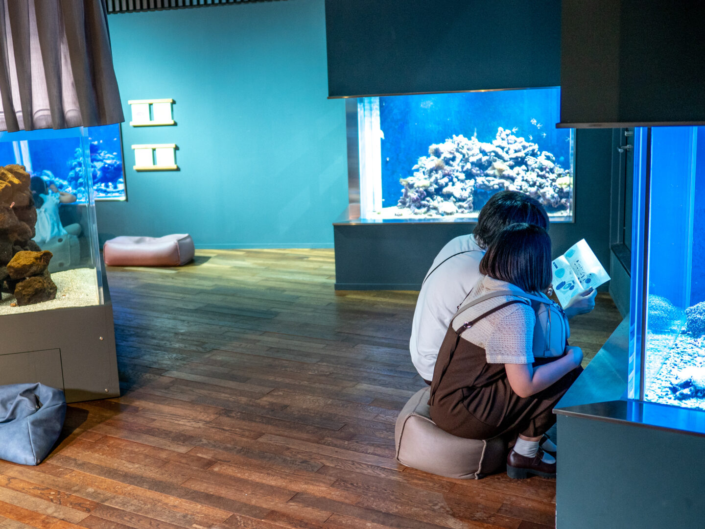 ゆっくりと水槽を見学できるように水槽の前にビーズクッションが置いてあり、写真撮影もとてもじっくりできます。また、靴を脱いで水槽を見られるスペースもありました。とにかく落ち着いて撮影できます。