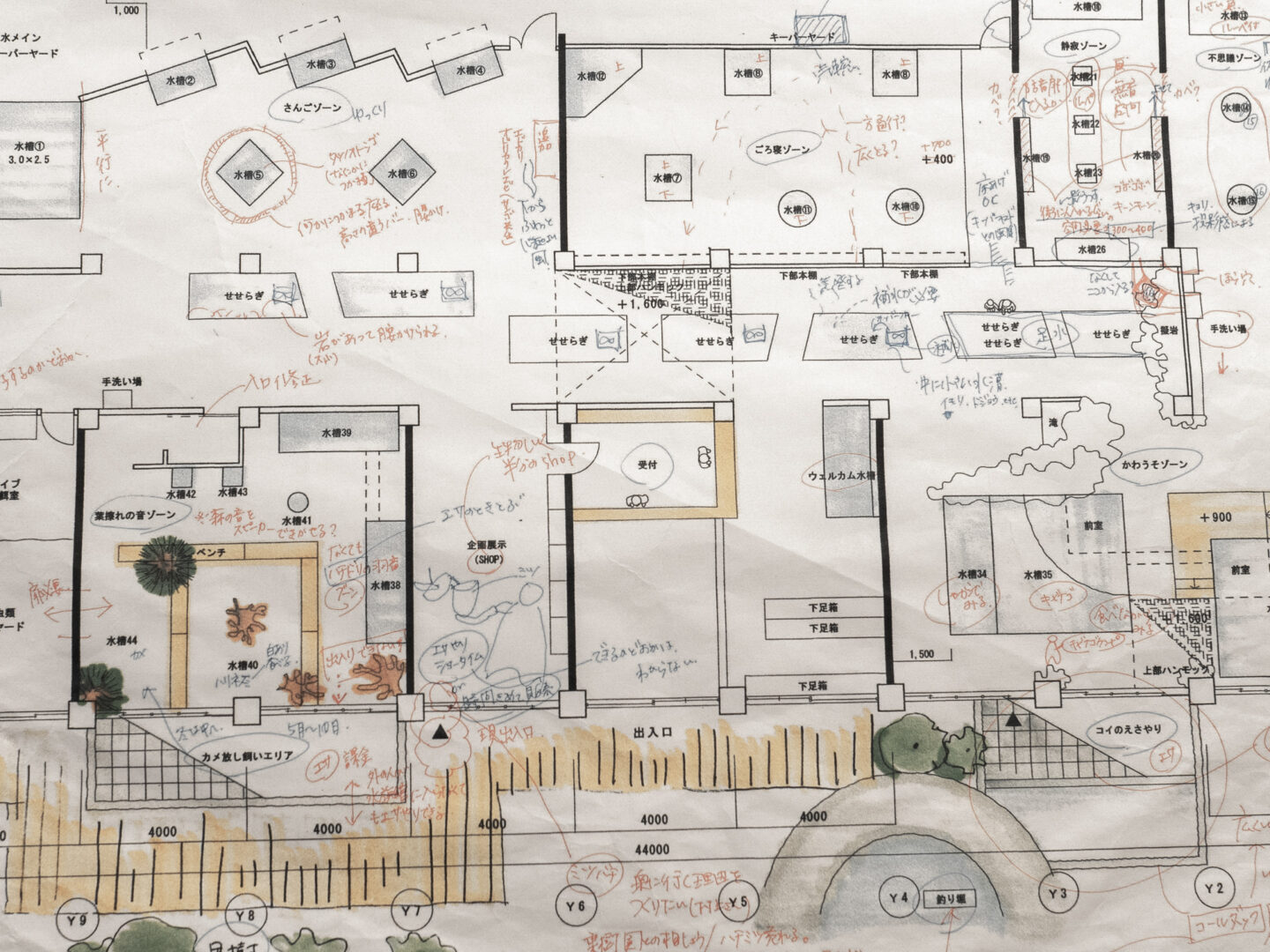 廃校をリノベーションしただけでなく、椅子の高さや本棚の配置など、非常に計算されて設計している水族館にただただ感心しました。この水族館の設計図が展示室に置いてあるのは、そういったアイデアの素晴らしさをアピールしたかったためでしょうか。