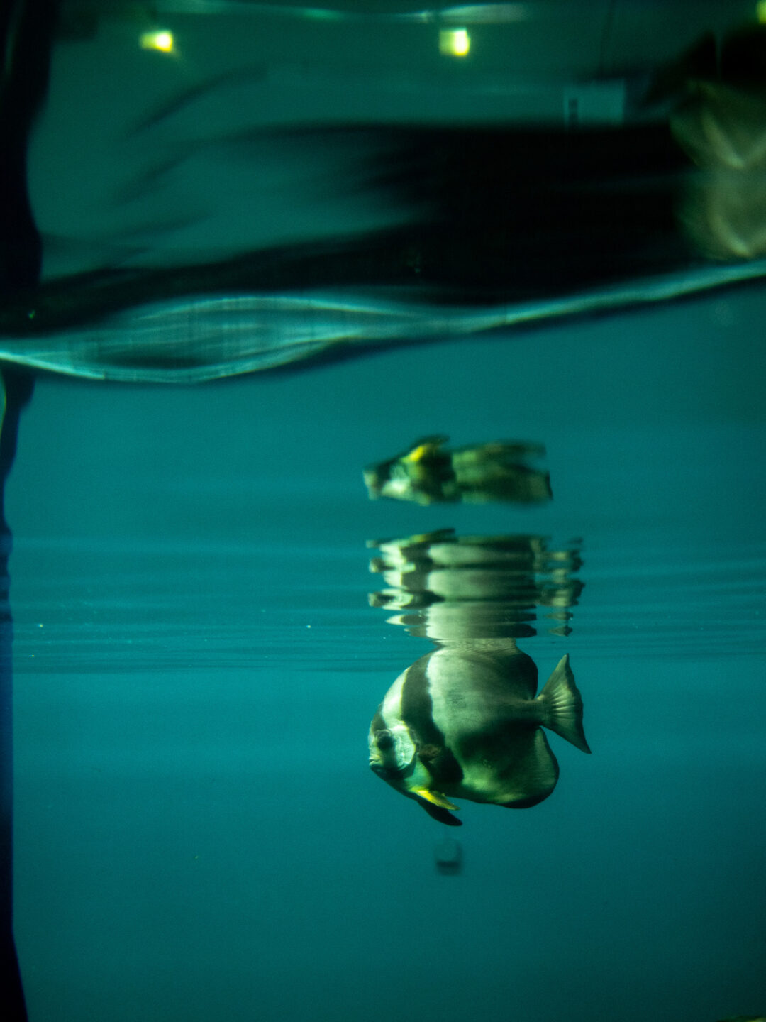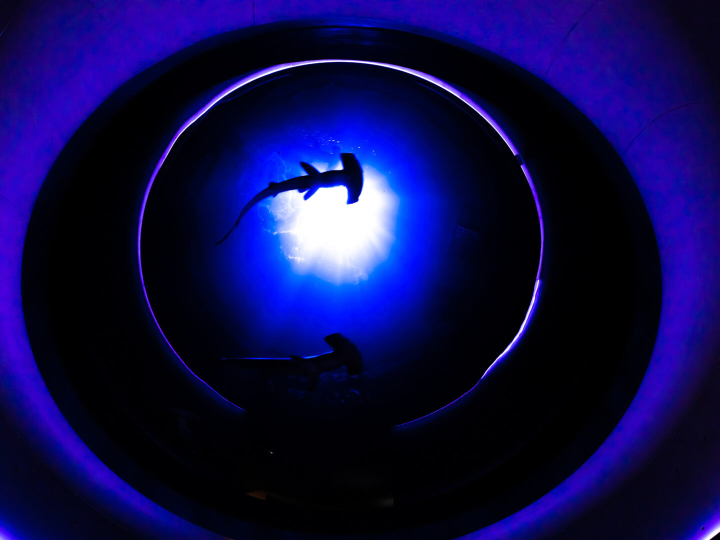 こちらはハンマーヘッドシャークの円形水槽。魚眼レンズで周りの空間を取り入れました。とても絵になりますね。