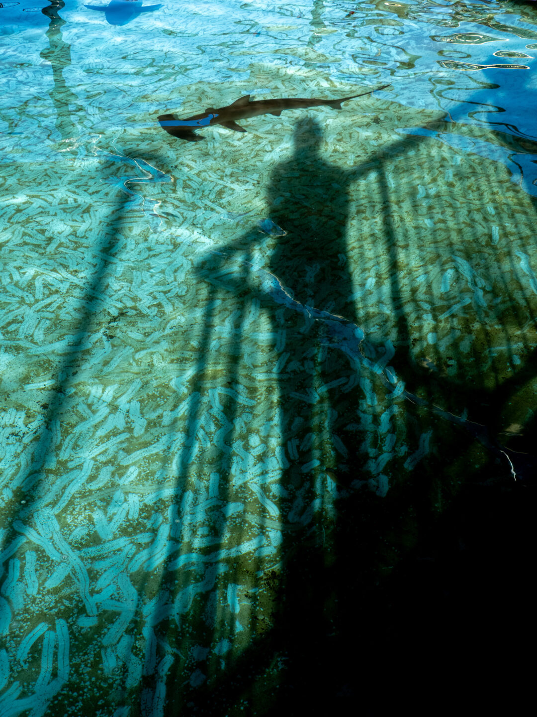 この水族館の目玉でもある、スイミングプールに泳ぐシュモクザメです。しかし現在このプールはカメが居るそうです。夕方のフェンスや街灯の影が入る時間帯がお勧めです。