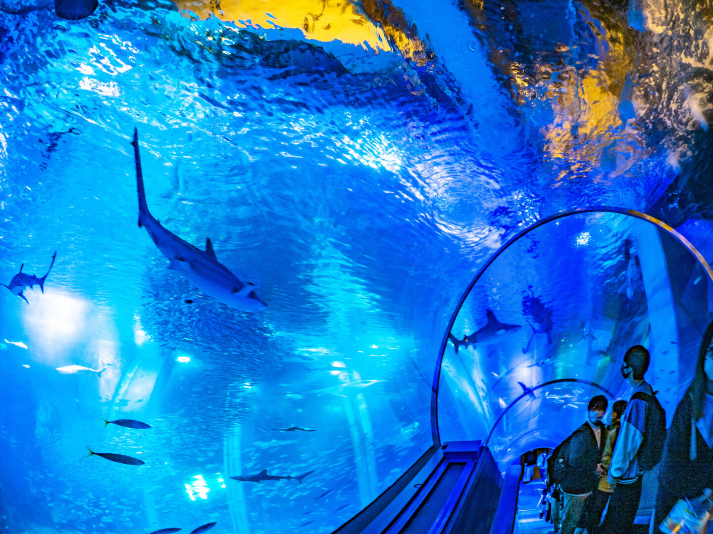 大水槽にはサメやエイなど沢山の魚を展示しています。下の写真はチューブ型の通路を取り入れて、魚眼レンズなどを使用して構図を工夫しました。