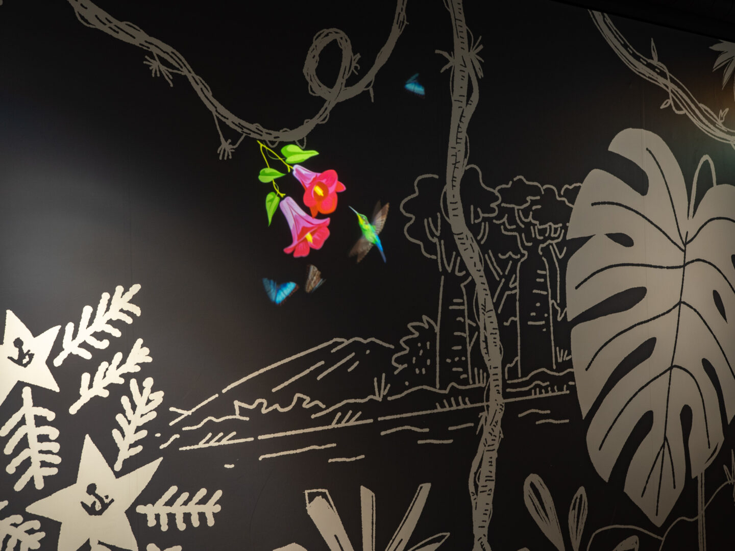 プロジェクションマッピングや特殊照明を多用しているので上の写真のようにチョークアート上にハチドリが飛び回っていて、とても楽しいです。