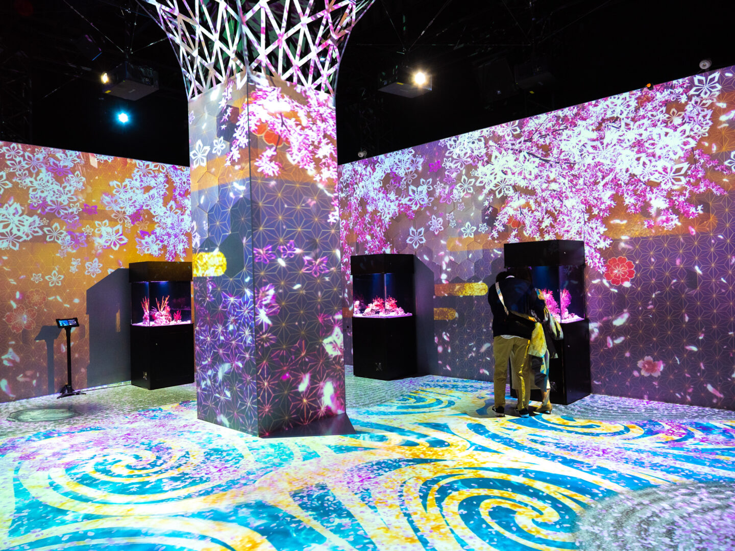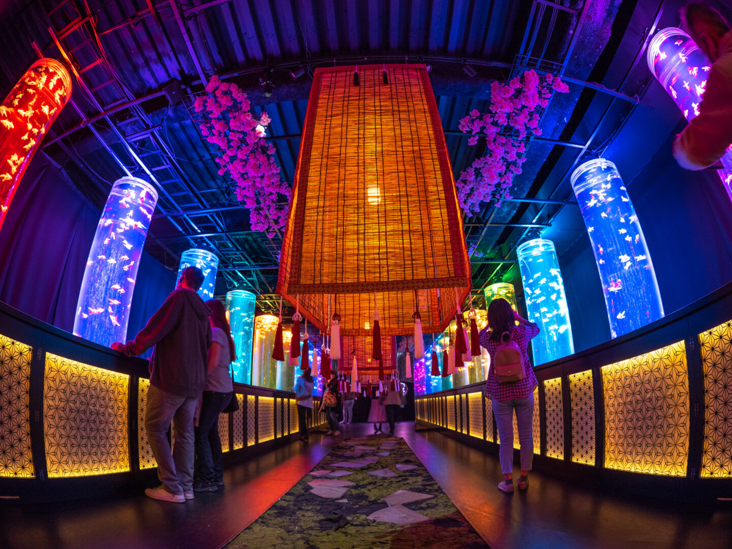 メインとなる「金魚の回廊」。神社建築に見られる回廊を表現した空間なのですがとても美しく、幻想的な空間でした。