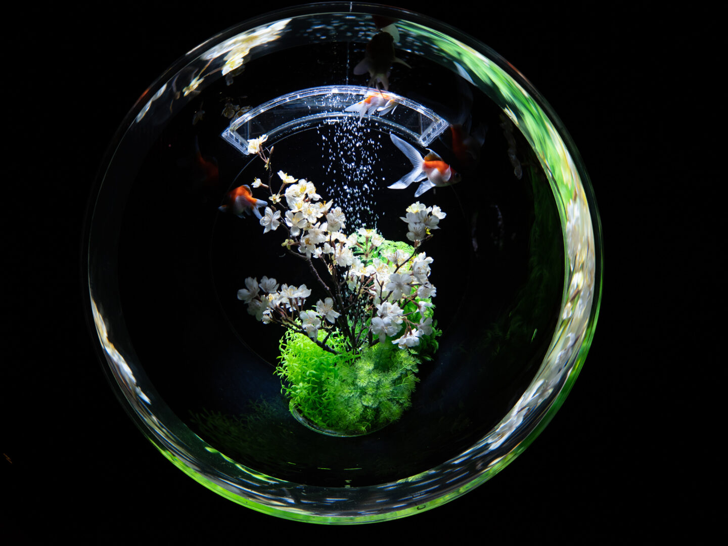 様々な色に変化する「金魚蒐集」は珍しい品種を中心に展示しています。魚眼レンズで近くまで寄って撮影すると、周辺の縁取りも面白く表現できて、まるで円周魚眼レンズを使用したかのような写真が撮影できました。