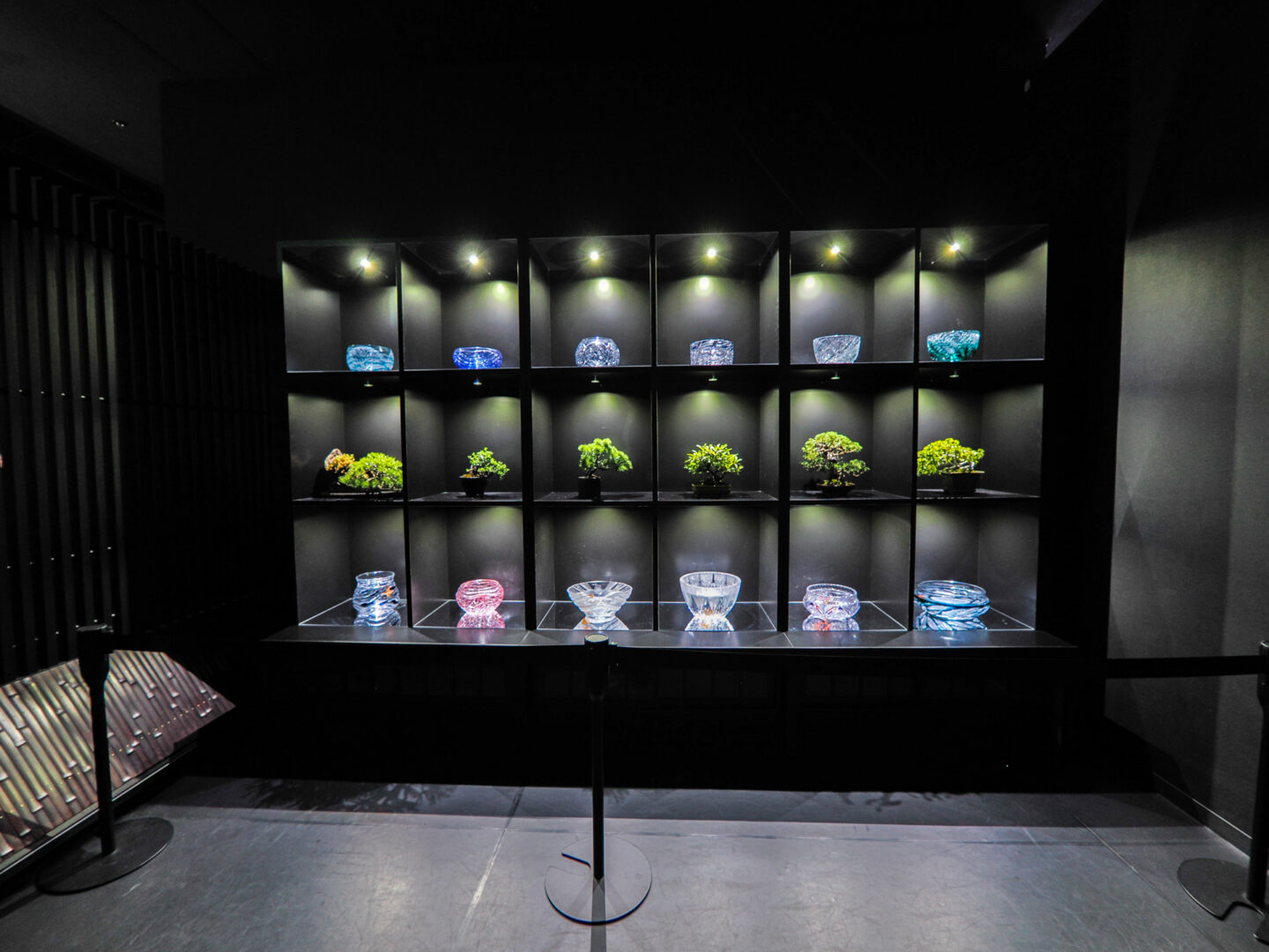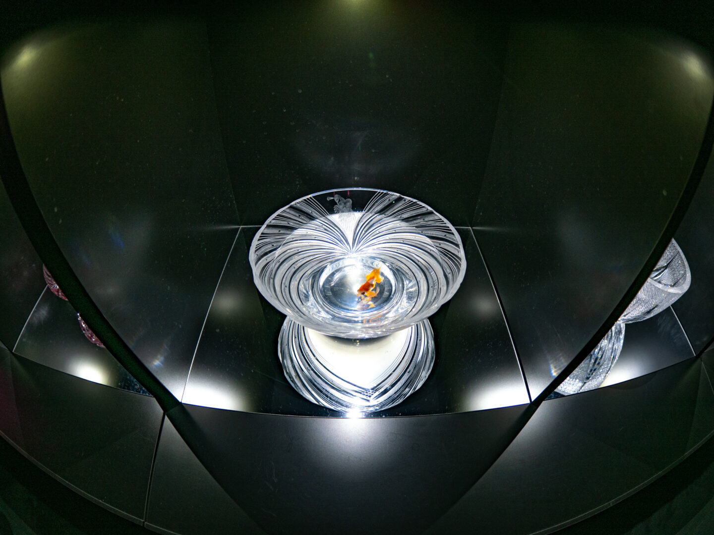 「金魚の飾り棚」は美しい器の江戸切子の中に金魚が泳いでいます。不思議な演出です。