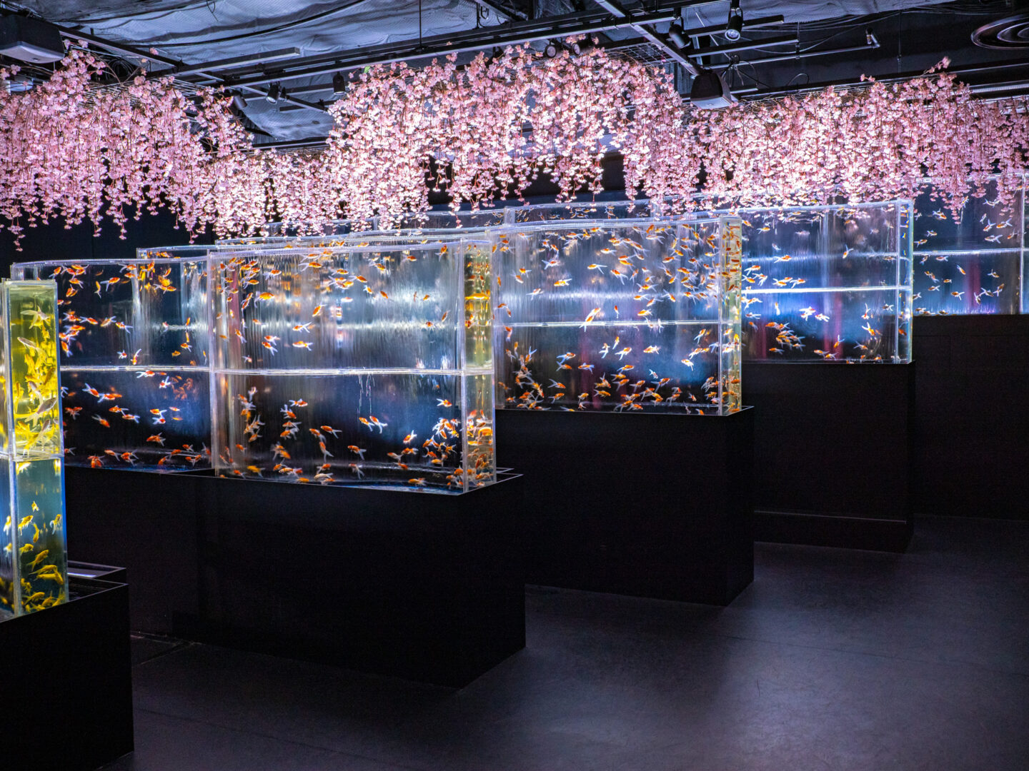 「金魚の滝」は斜めに傾斜させてレイアウトした長方形の水槽が静かな滝をイメージして作られた展示です。撮影した日は丁度桜の時期でしたので上部には桜の花があしらわれてこちらも非常に幻想的でした。