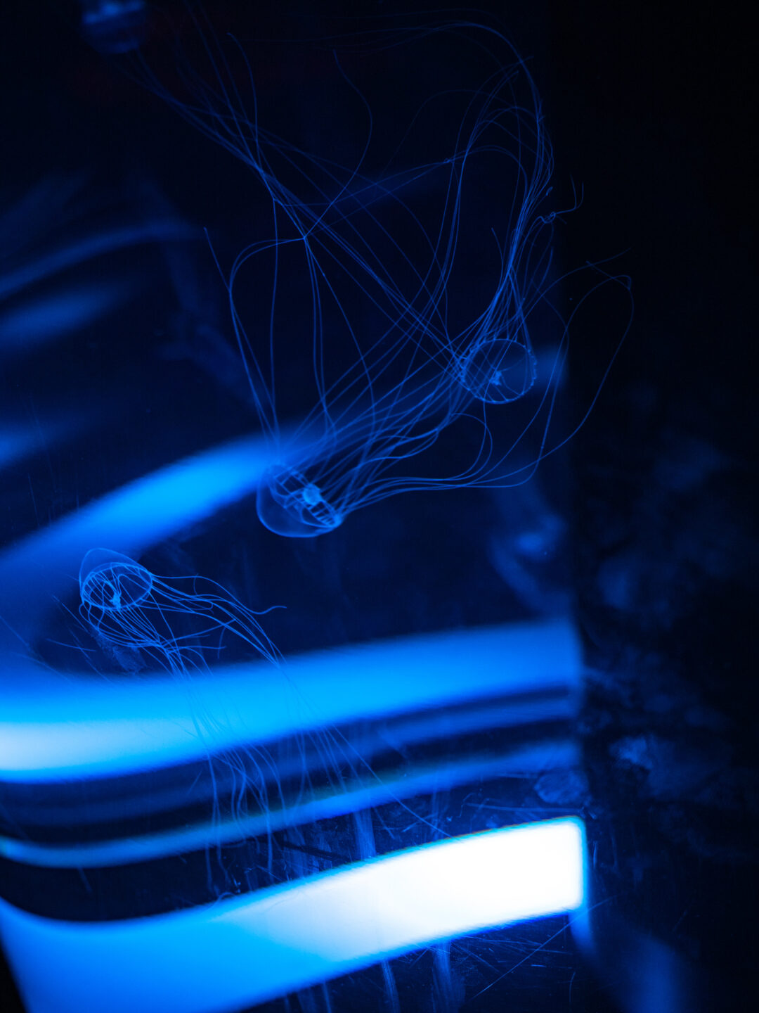 クラゲ水槽は沖縄のDMMかりゆし水族館を彷彿とさせるような展示でした。写り込みの曲線が美しいポイントを部分的に撮影して曲線のラインを強調して奥行き感を出してみました。