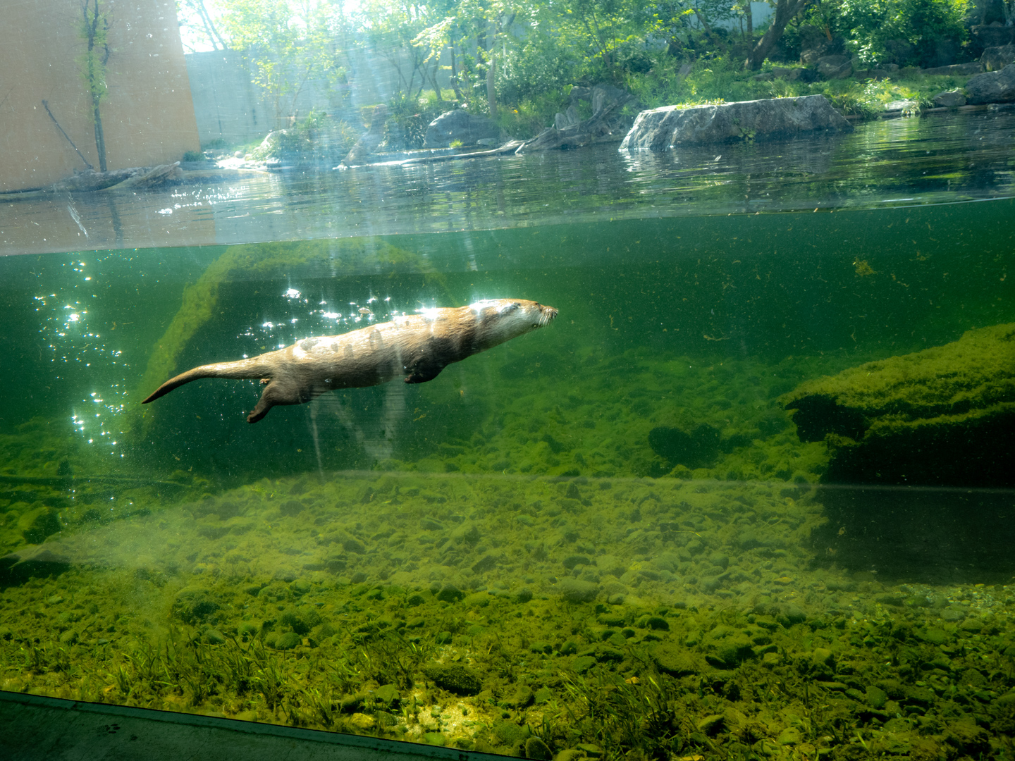 水中を泳ぐカワウソも専用の広い水槽でゆっくり観察できますし、世界でも飼育するのが大変難しいギンカガミの展示もあります!
